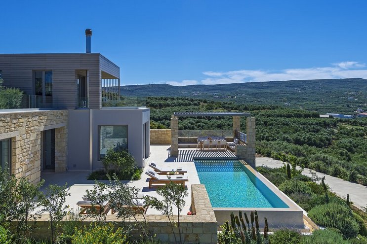 Die Villa Lumina ist ein moderner Rückzugsort in einem 7.000 m² großen Olivenhain mit privatem Pool und bietet einen atemberaubenden Blick auf die Bucht von Chania und die Weißen Berge.