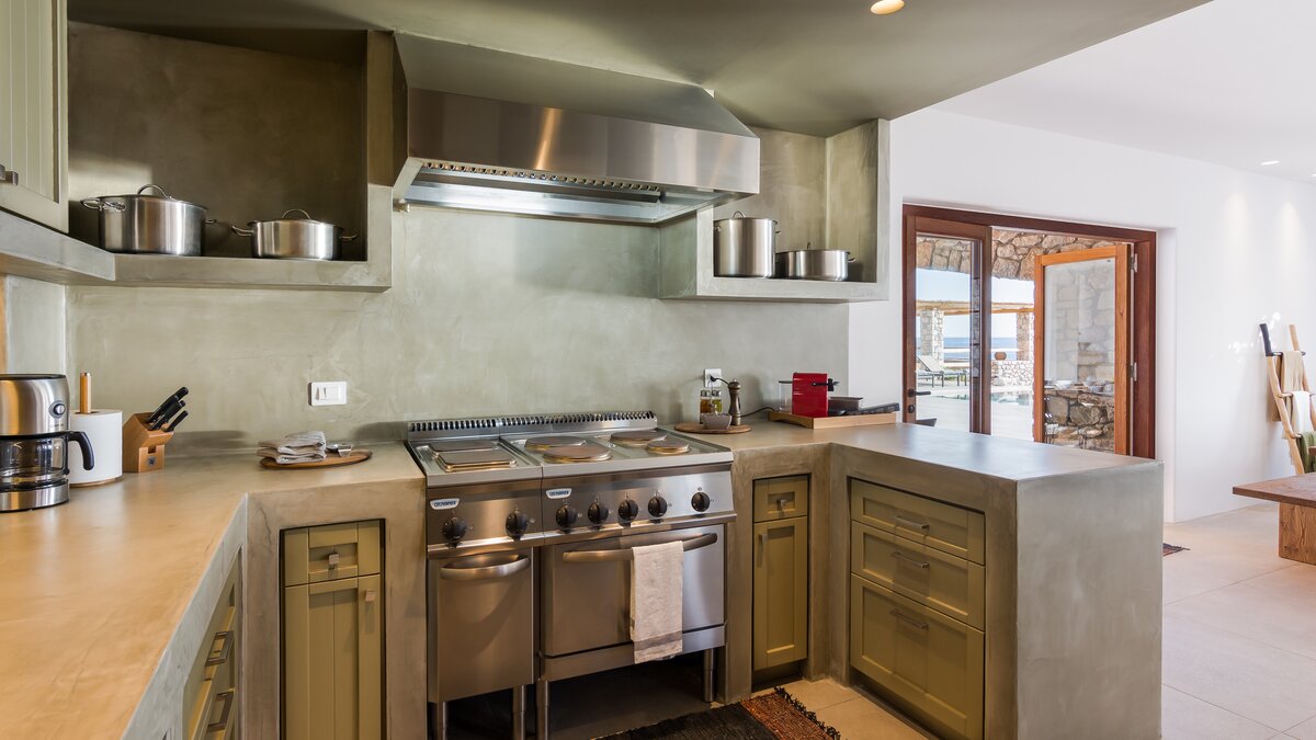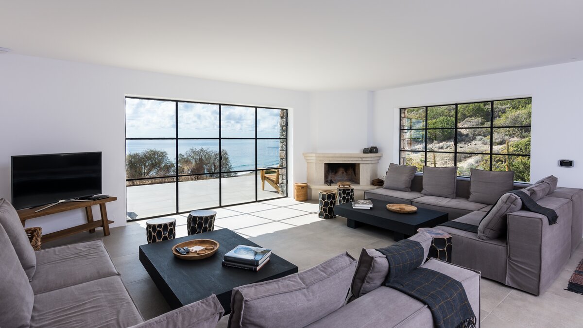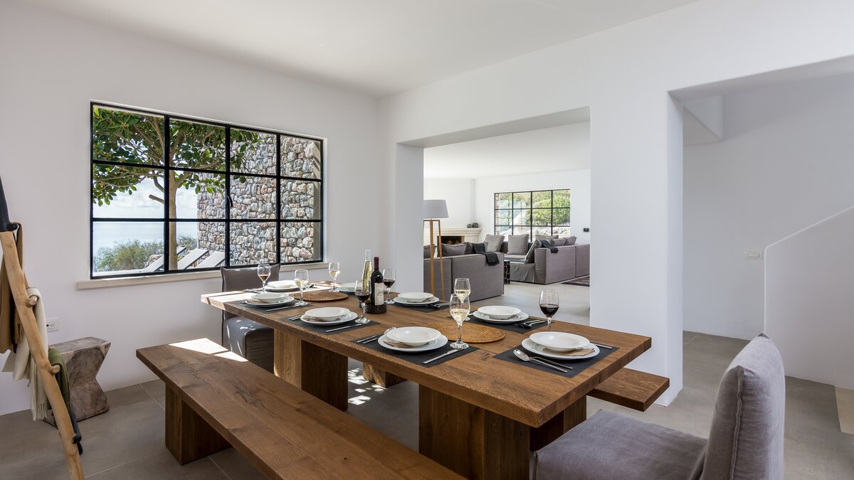Das Beach House Ari besticht durch ein anspruchsvolles Design, das sowohl Komfort und auch Eleganz verkörpert. Der offene Wohnbereich integriert nahtlos ein stilvolles Wohnzimmer, einen Essbereich und eine voll ausgestattete Küche. Natürliches Licht durchflutet den Bereich durch große Fenster und bietet einen malerischen Blick auf das türkisfarbene Wasser und das üppige Grün.