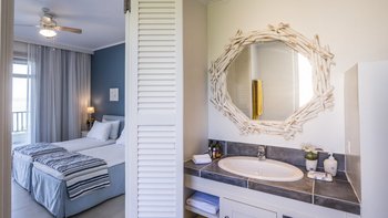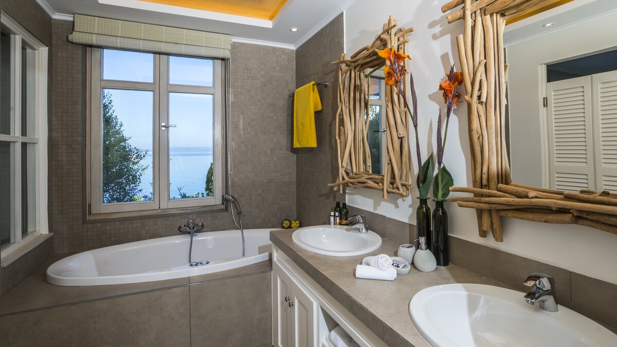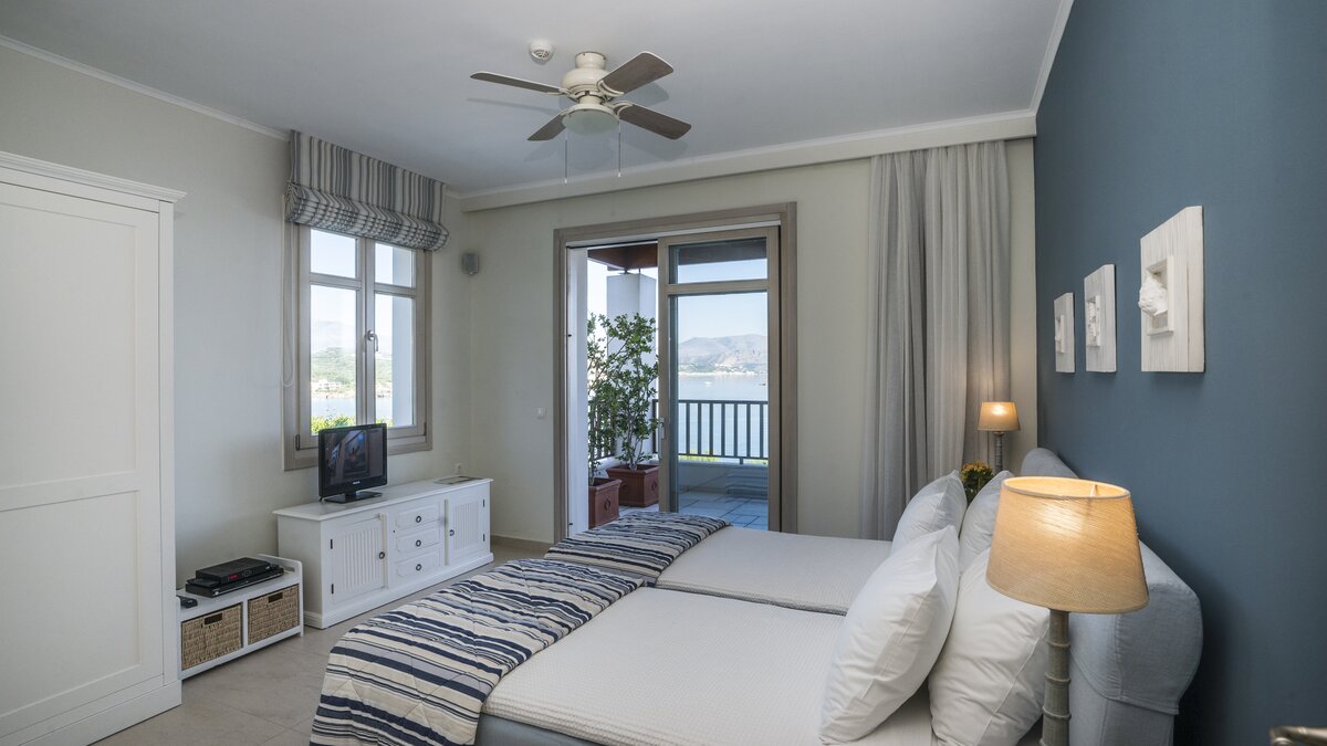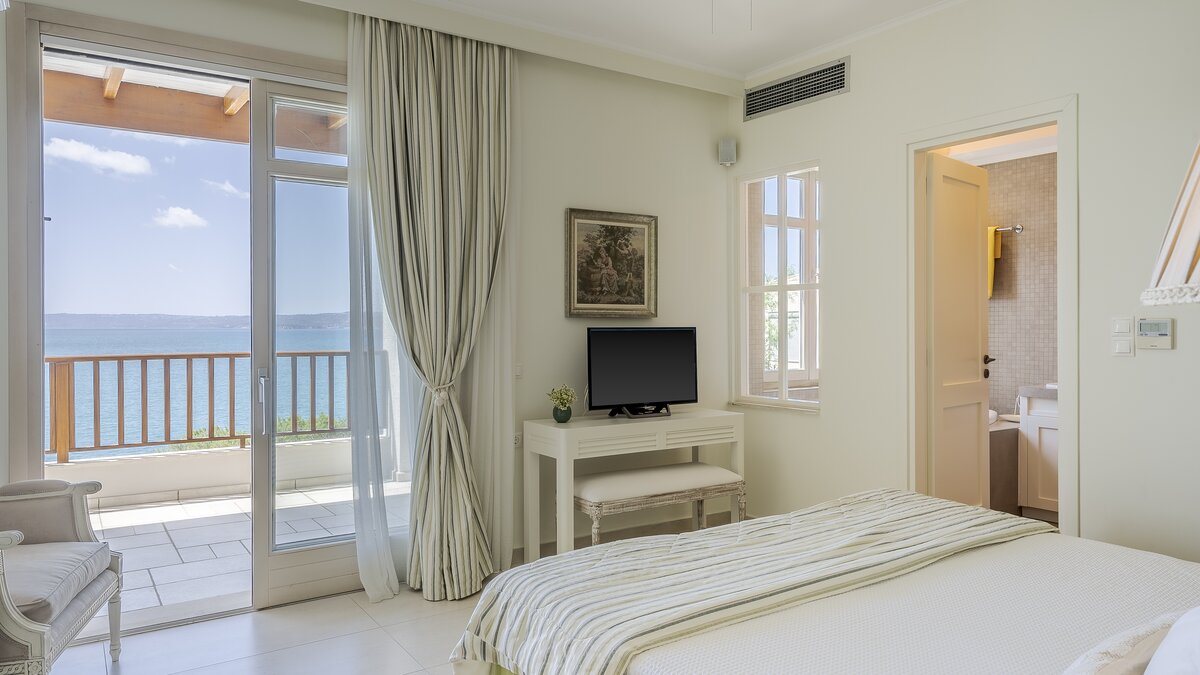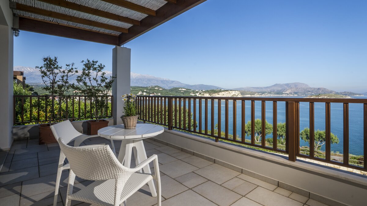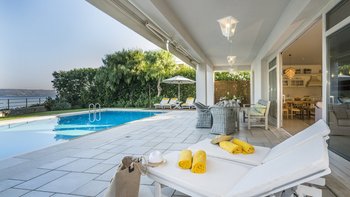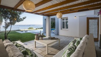 Diese weiß getünchte Villa, eine der drei benachbarten Schwestervillen, ist im Salzwasser-Stil eines luftigen Strandhauses eingerichtet, das mit sorgfältig ausgewählten Artefakten bestreut ist, um das Küstenmotiv zu ergänzen. Draußen, am großen und schönen Pool, sitzen einfache Liegestühle Seite an Seite mit stilvollen Sonnenliegen und genießen einen ruhigen Blick auf die Bucht von Souda. Denen von jungen Palmen gesäumten und natürlich von Grünes abgeschirmten Gärten bieten eine ruhige Privatsphäre für ein „Wohnzimmer“ im Freien unter einem Pavillon. Eine überdachte Terrasse am Pool führt in den geräumigen Wohnbereich der Villa, der mit WLAN, Satellitenfernsehen und einer Musikanlage im ganzen Haus ausgestattet ist.