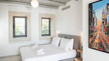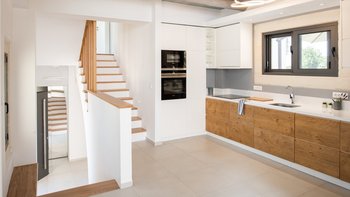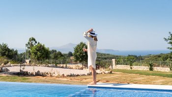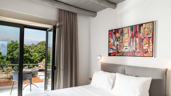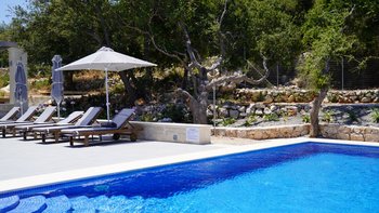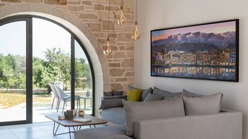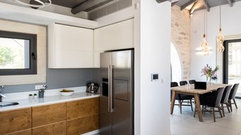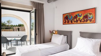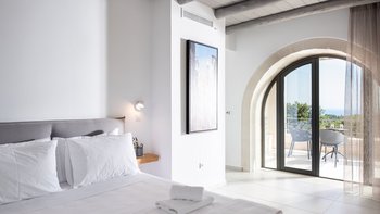 Der moderne Charakter setzt sich auch im Haupthaus fort, wo ein elegantes graues und weißes Interieur mit moderner Beleuchtung und Holzelementen kombiniert wird. Unter einer Gewölbedecke öffnet sich das große Wohnzimmer zu einem stilvollen Essbereich, während die geräumige Küche komplett mit einem Backofen, einer Mikrowelle und einem verchromten amerikanischen Kühl- und Gefrierschrank ausgestattet ist. Es gibt drei Schlafzimmer in der Villa – ein Zweibett, das zu einem Kingsize-Bett gemacht werden kann, im unteren Erdgeschoss und zwei Kingsize-Schlafzimmer im zweiten Stock. Denen mit weiß getünchten Wänden und einem eigenen Duschbad ausgestatteten Schlafzimmer sind hell und geräumig und führen zu einem privaten Balkon oder einer Terrasse mit Blick auf das Grundstück oder das Meer.