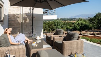 Die Villa Annie ist eine moderne und schicke Steinvilla, versteckt auf privaten nach, geschlossenen Grundstücken im Nordwesten Kretas. Nur 2,7 km von den hübschen engen Gassen des Dorfes Douliana entfernt, besticht dieses elegante Anwesen mit seinen umlaufenden Sonnenterrassen und der Meer- und Bergkulisse. Der große Infinity-Pool ist ein Genuss der Villa – stilvoll gepaart mit Liegen, Sonnenschirmen und skurrilen Sitzgelegenheiten wie dem ineinander verschachtelten Eierstuhl. Ein Rattan-Sitzbereich mit hübscher Laternenbeleuchtung ist ein großartiger Ort, um vor oder nach dem Abendessen einen Drink zu trinken, während ein überdachter Ess- und Außenküchenbereich Ihnen die Möglichkeit bietet, während der sengenden Sommermonate im Freien zu speisen.