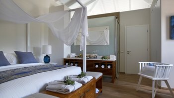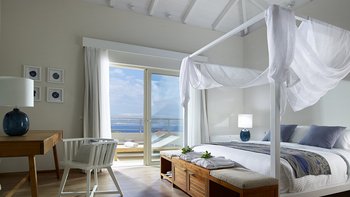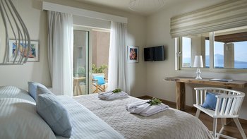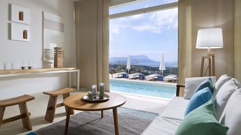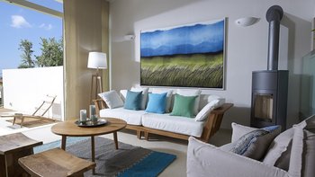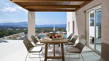 Das ruhige und aufgeräumte Design der Armonia verbindet gedämpfte, neutrale Töne mit Kunstwerken und Artefakten in brillantem Aqua, den klaren Linien einer glänzenden weißen Küche und einer Unmenge edler Teakholz-Möbel drinnen und draußen. Dessen luftiges Wohnzimmer öffnet sich durch eine ganze Fensterwand auf eine Holz-Sonnenterrasse neben dem privaten beheizten Pool, der einen flachen Bereich für Kinder hat und von einer geräumigen Essterrasse überblickt wird. Beiden bieten einen weiten Panoramablick über mehrere Dörfer bis hin zur malerischen Souda-Bucht, ebenso wie die drei Schlafzimmer der Villa, jedes mit eigenem möblierten Balkon, schickem Bad und/oder Dusche, WLAN und Satelliten-TV.