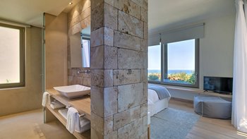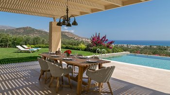 Aufgeräumt, dezent und schick, steht dieses sehr moderne Haus auf einem drei Hektar großen, geschlossenen Grundstück, nur 1,5 km von den Geschäften und Restaurants am Wasser im Dorf Kolymvari und 2 km vom langen Sand- und Kieselstrand entfernt. Dessen stilvolle Zimmer der Villa sind eine Oase der Ruhe und des Luxus und verfügen über Eichenböden, freiliegende Steinwände, hohe Sparrendecken und Dekor und Möbel in sanften Erdtönen. Zu den außergewöhnlichen Einrichtungen gehören ein heller und luftiger Fitnessraum und ein gewölbter Steinweinkeller mit griechischen und kretanischen Weinen. Der Wohnbereich ist ein schönes offenes Arrangement, in dem eine coole Retro-Küche, gut ausgestattet mit modernen Geräten, an ein ruhiges und geräumiges Wohn- / Esszimmer mit einer Fensterwand auf die herrliche Aussicht angrenzt.