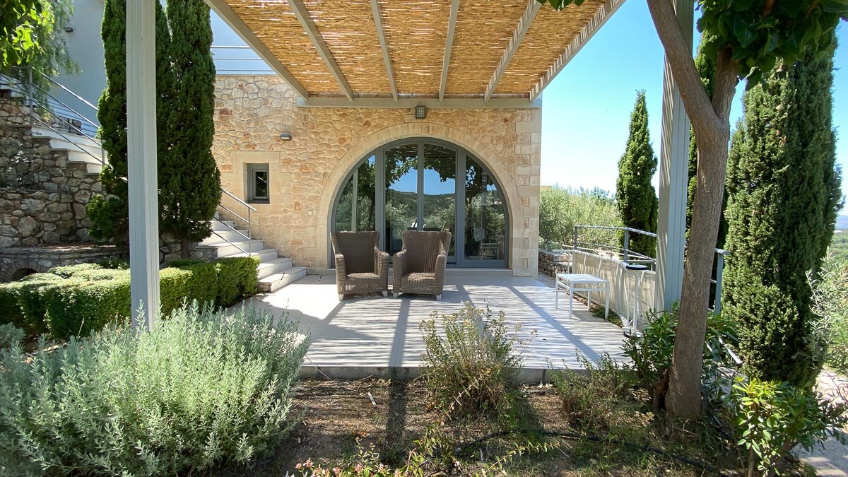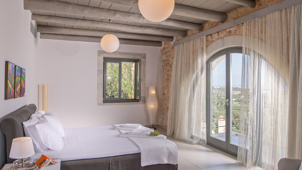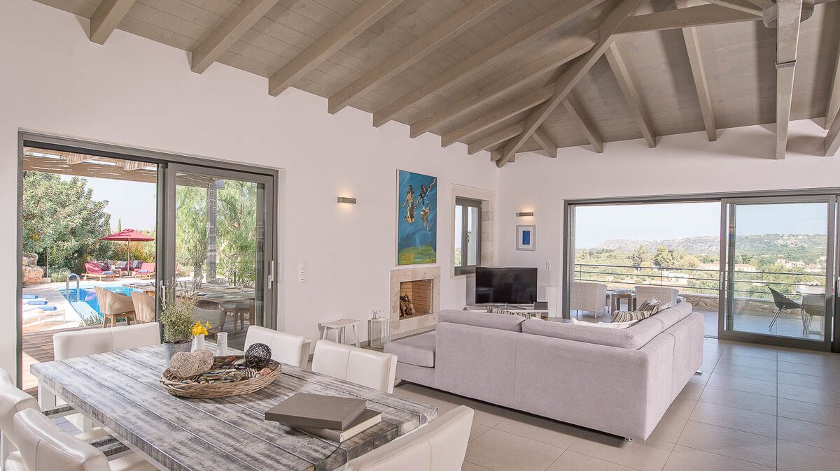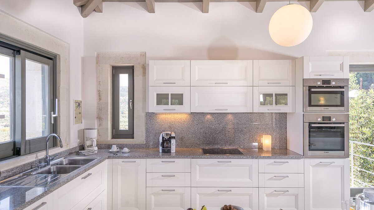 Jedes der drei Schlafzimmer verfügt über ein eigenes Bad mit Dusche, und auf der Eingangsebene, an der Spitze des Hauses, eine hohe Dachsparrendecke über einen luftigen Gesellschaftsraum mit einer eleganten weißen Küche, Ess- und Sitzbereiche und Zugang zu einer Essterrasse neben dem Pool. Deren Villa ist mit WLAN, Sat-TV und einer Fußbodenheizung / -kühlung ausgestattet und bietet einen Kochservice, um seine idyllische Gemütlichkeit zu verstärken. Mit einer Bäckerei und einfachen Tavernen im Dorf, die Strände von Kalyves und Almyrida sind nur 4-6 km Autofahrt entfernt.