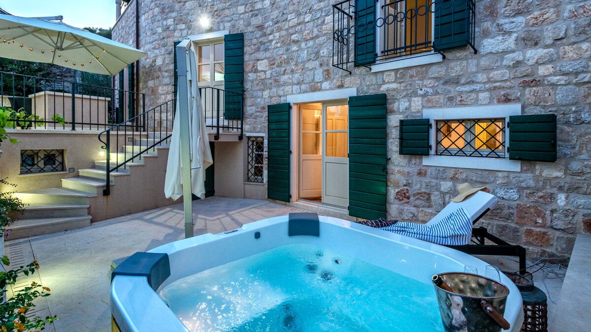 Eingebettet in die Straßen der Altstadt von Hvar und nur drei Minuten zu Fuß vom Stadtplatz entfernt, ist dieses wunderschöne Anwesen der perfekte Ort für Familien oder Freunde, die die Insel Hvar erkunden möchten. Hvar House ist eine renovierte und moderne Villa mit wunderschönen Steinfassaden, klassischen grünen Fensterläden und viel modernem Komfort. Es gibt zahlreiche Außenbereiche zum Entspannen, darunter einen charmanten Essbereich im Freien neben dem privaten, geschlossenen Pool, einen Jacuzzi auf der vorderen Terrasse und einen Obstgarten. Mit einer flexiblen Aufteilung für Familien oder größere Gruppen verfügt das Hvar House über vier Schlafzimmer in der Hauptvilla und eines in einem Nebengebäude, alle mit eigenem Bad. Im Inneren wurde das Anwesen sorgfältig zu einem hohen Standard eingerichtet und mit neutralen Farbtönen, freiliegenden Steinmauern und Holzböden dekoriert. Deren Haupthaus erstreckt sich über drei Ebenen mit zwei Schlafzimmern auf halben Stockwerken. Im Erdgeschoss öffnet sich die OFFENER GRUNDRISS Küche, das Wohn- und Esszimmer auf eine Terrasse. Deren obere Ebene beherbergt das Hauptschlafzimmer mit Super-Kingsize-Bett, Bad en suite mit Badewanne und separater Dusche und direktem Zugang zu einer großen privaten Terrasse mit einem komfortablen Sitzbereich und herrlichem Blick auf die Küste von Hvar.