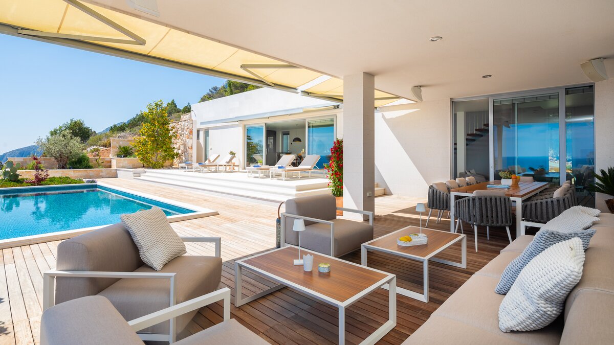 Es ist unbestreitbar, dass die Villa Orchid eine herausragende Villa ist. Einzigartig in ihrem Design vor einer Kaskade von Terrakotta-Dächern, ist Orchid übermodern und ein Blickfang, mit Panoramafenstern und einer fabelhaften Terrasse, die das Epizentrum dieser Villa bildet. Direkt neben dem Haus befindet sich ein Essbereich im Freien, der für den Komfort der Gäste schattig ist. Holzterrassen erstrecken sich über die gesamte Breite der Terrasse unter einem bequemen Sitzbereich und einer Reihe von Liegestühlen, auf denen man die Sonne genießen kann. Dessen besonderes Highlight ist ein herrlicher beheizter Infinity-Pool, der die Linien zwischen dem Wasserrand und dem saphirblauen Meer dahinter verwischt und ein perfekter Ort und Ort, um den puderrosafarbenen Himmel zu bewundern.