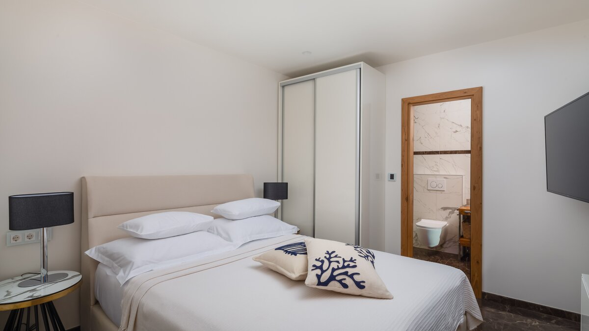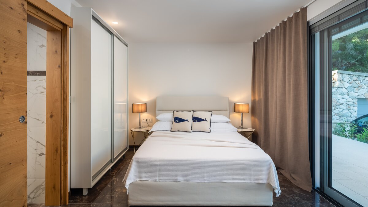 Die Unterkunft ist auf zwei Etagen Split. Im Erdgeschoss befinden sich eine kompakte und moderne Küche und ein Esszimmer im Innenbereich sowie ein komfortabler Wohnbereich, die alle in eleganten Grautönen mit kühlen Marmorböden unter den Füßen gehalten sind.Es gibt fünf fabelhafte Schlafzimmer auf zwei Etagen, die alle entweder eine Dusche oder ein Bad en suite haben. Dessen beste Schlafzimmer des Hauses befindet sich im ersten Stock mit raumhohen Fenstern mit Blick auf das Meer.