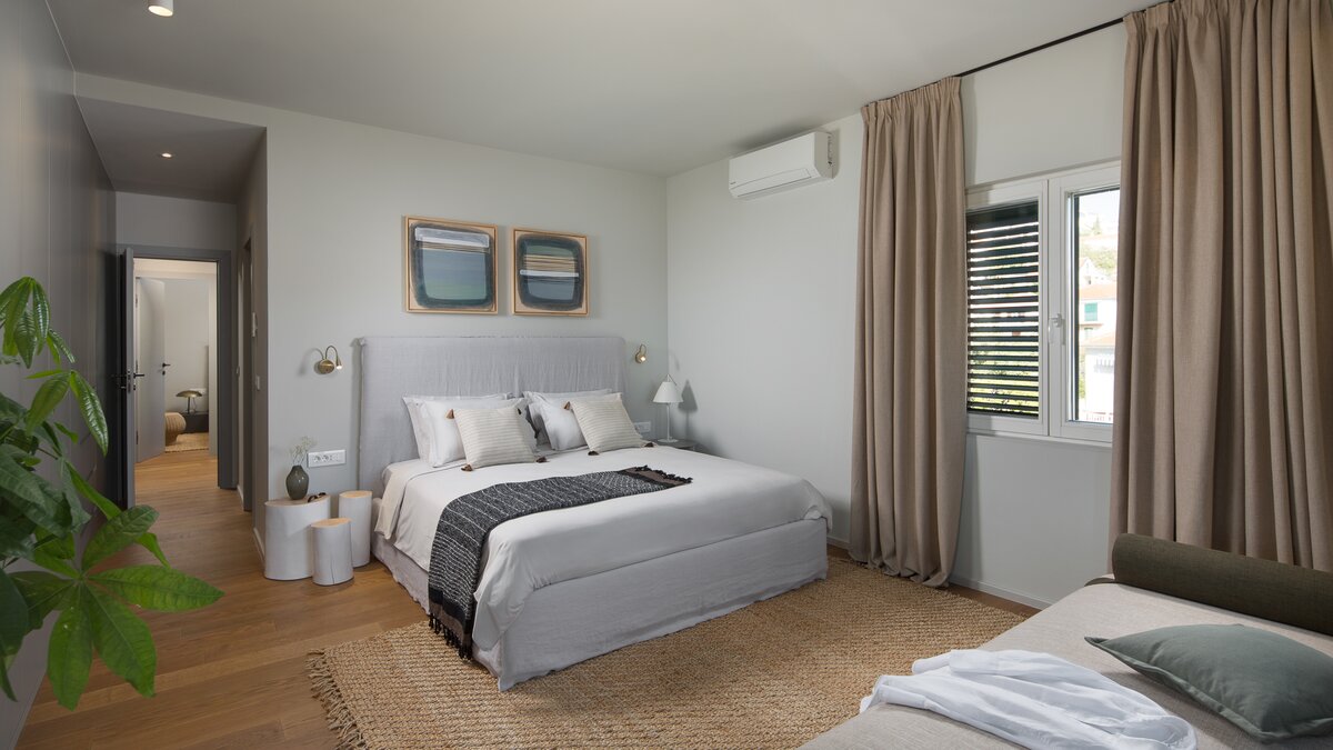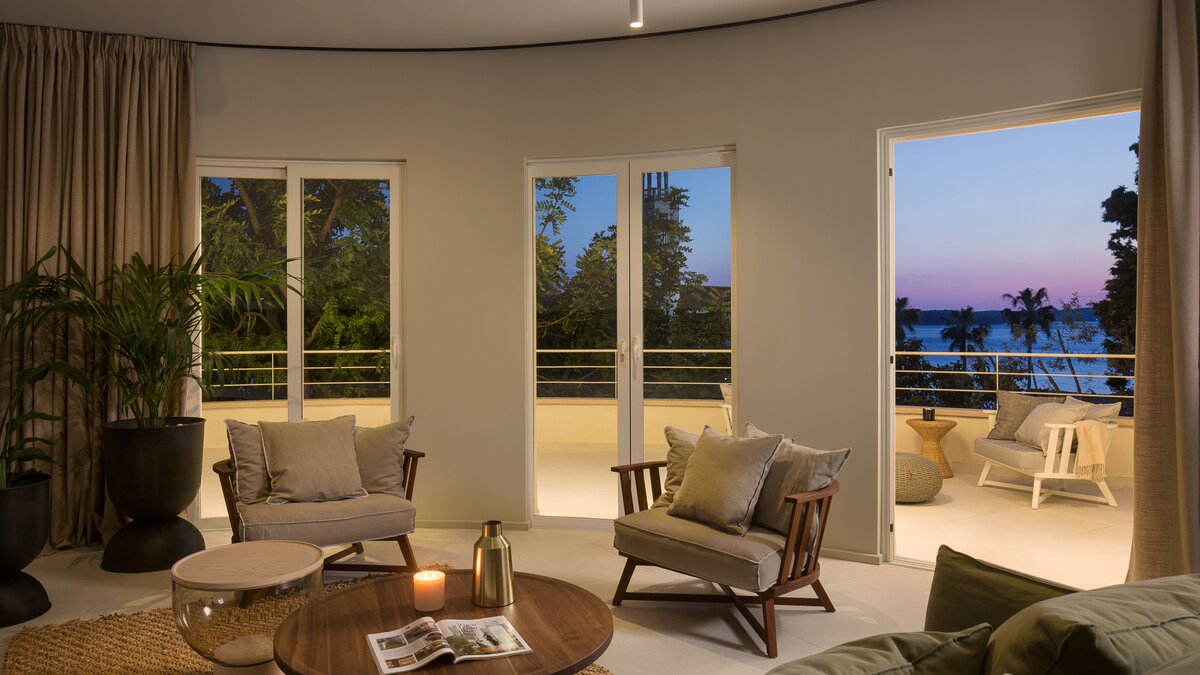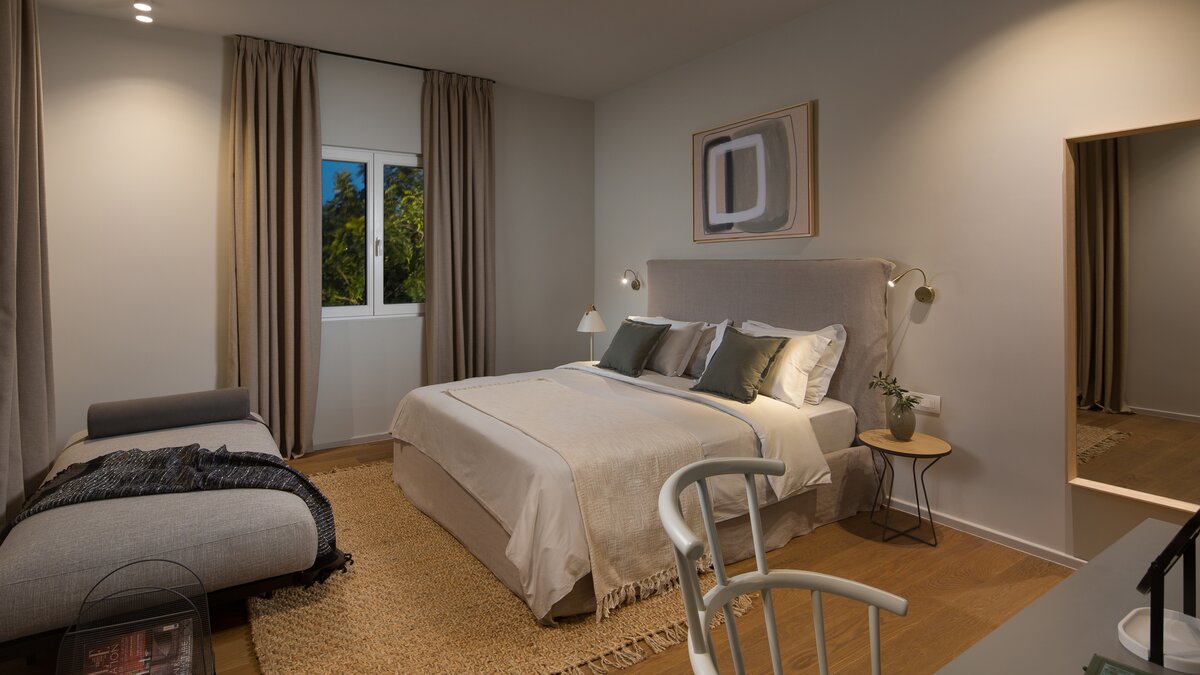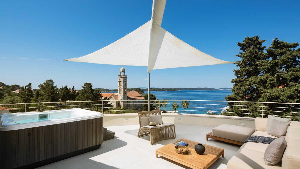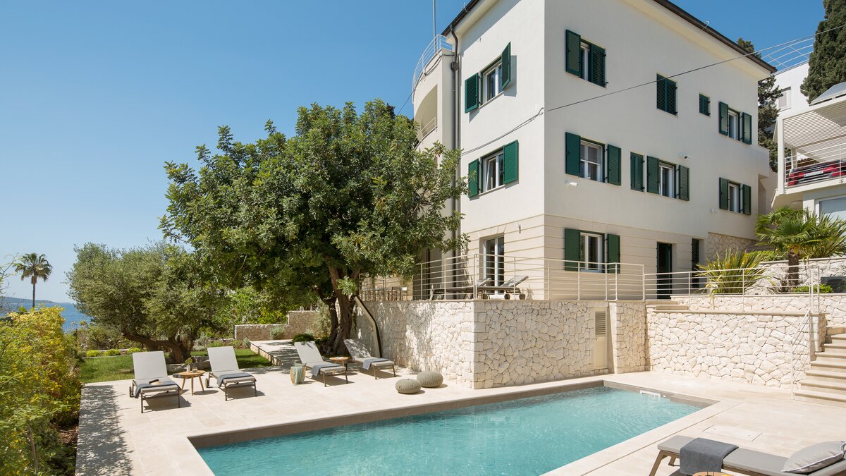 Die atemberaubende Villa Sunset ist ein geräumiges, vierstöckiges Anwesen, das sich ideal für Wellnessreisen mit der Familie oder Freunden eignet. Jeder Ebene der Villa verfügt über einen eigenen Wohnbereich, eine Küche und Zugang zu einer Terrasse oder einem Balkon. Dessen helle und luftige Erdgeschoss umfasst große Wohnräume, ein Schlafzimmer mit Badund ein Fitness- und Massagestudio. Über die Treppe gelangen Sie zu einer weiteren stilvollen Küche und einem Wohnbereich und zwei weiteren Schlafzimmern mit Bad. Im Dachgeschoss befinden sich die Wohn-, Ess- und Küchenbereiche mit einem Schlafzimmer mit Bad, das zur Terrasse führt. Hier finden die Gäste einen Whirlpool, eine Außenküche und einen Essbereich im Freien vor. Deren Villa verfügt auch über einen bezaubernden Garten mit einem beheizten Pool, der von Liegestühlen umgeben ist. Der Garten bietet einen unglaublichen Blick auf die Adria und das umliegende Grün.