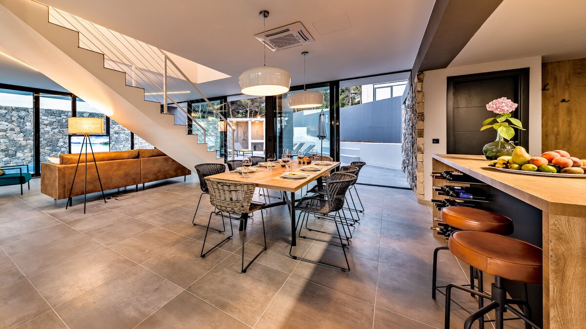 Mit herrlichem Blick auf die mediterrane Flora und die Adria ist die Villa Lumin ein modernes Anwesen mit atemberaubenden Möbeln und PRIVATER POOL. Es gibt vier geräumige Schlafzimmer, jedes mit eigenem Bad, Farbgebung und Blick auf das Meer. Im Wohnbereich lassen raumhohe Fenster viel Tageslicht herein, mit einem Flatscreen-TV und bequemen Samtmöbeln. Deren voll ausgestattete Küche ist ähnlich elegant und modern, mit einer Frühstückstheke und einem Esstisch für acht Personen. Obwohl die Villa in jeder Hinsicht modern ist, schafft es sie, dank ihrer Natursteinakzente einen Hauch der traditionellen Architektur der Region zu präsentieren.