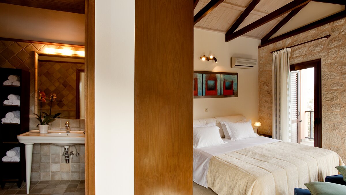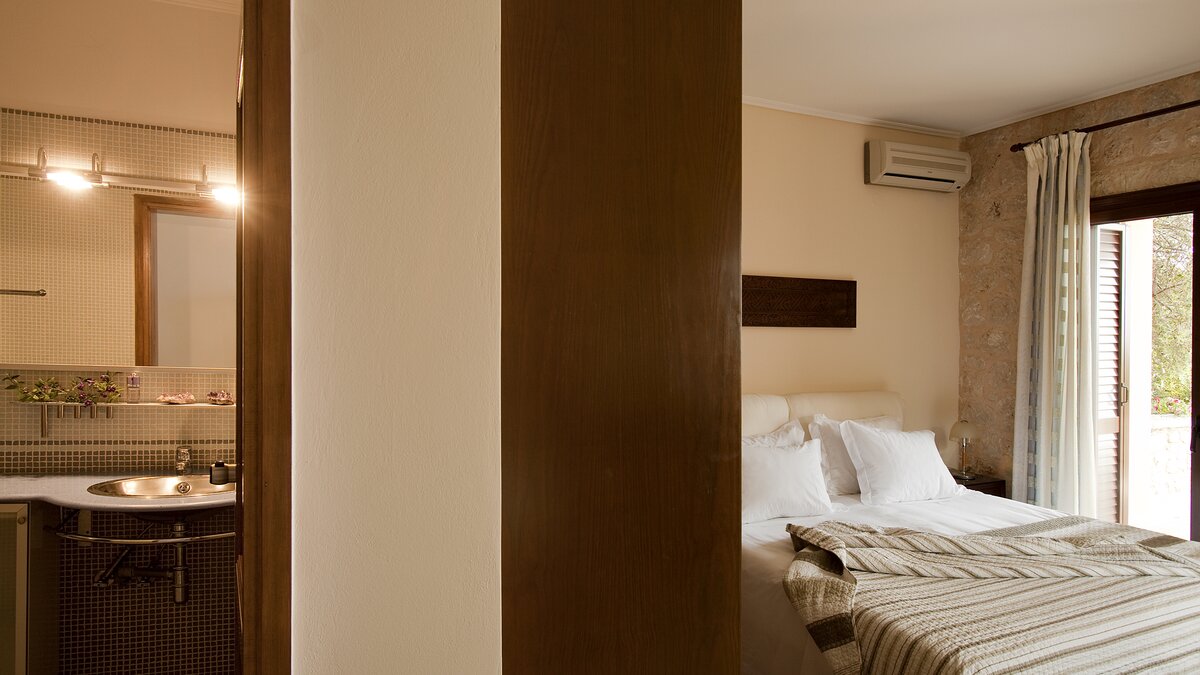 Das Erdgeschoss ist hell und luftig, dank hoher Decken und großer Fenster, die den Blick auf das Meer und den Pool frei lassen. Ein offener Wohn-, Ess- und Küchenbereich nutzt die Aussicht optimal, mit französischen Fenstern, die auf die sonnendurchfluteten Terrassen führen. Ein Schlafzimmer mit eigenem Duschbad teilt sich ebenfalls diese Ebene, komplett mit einer eigenen romantischen Terrasse mit Meerblick. Auf der UNTERE ETAGE befindet sich ein zweites Schlafzimmer mit direktem Zugang zum Garten und ein weiteres en-suite Duschbad, was die Villa ideal für zwei Paare oder kleine Familien macht.