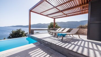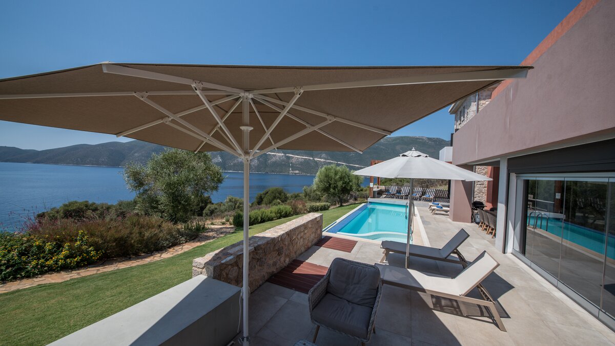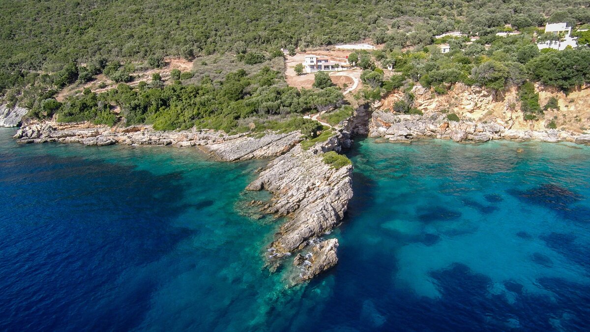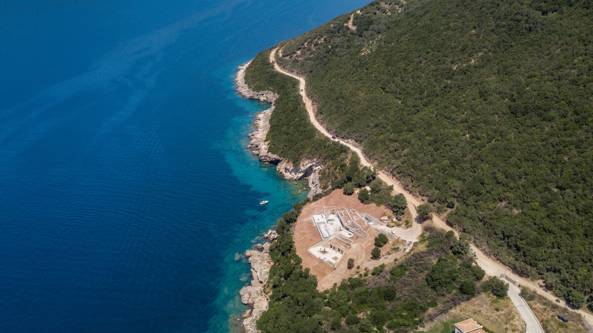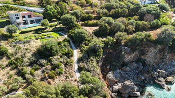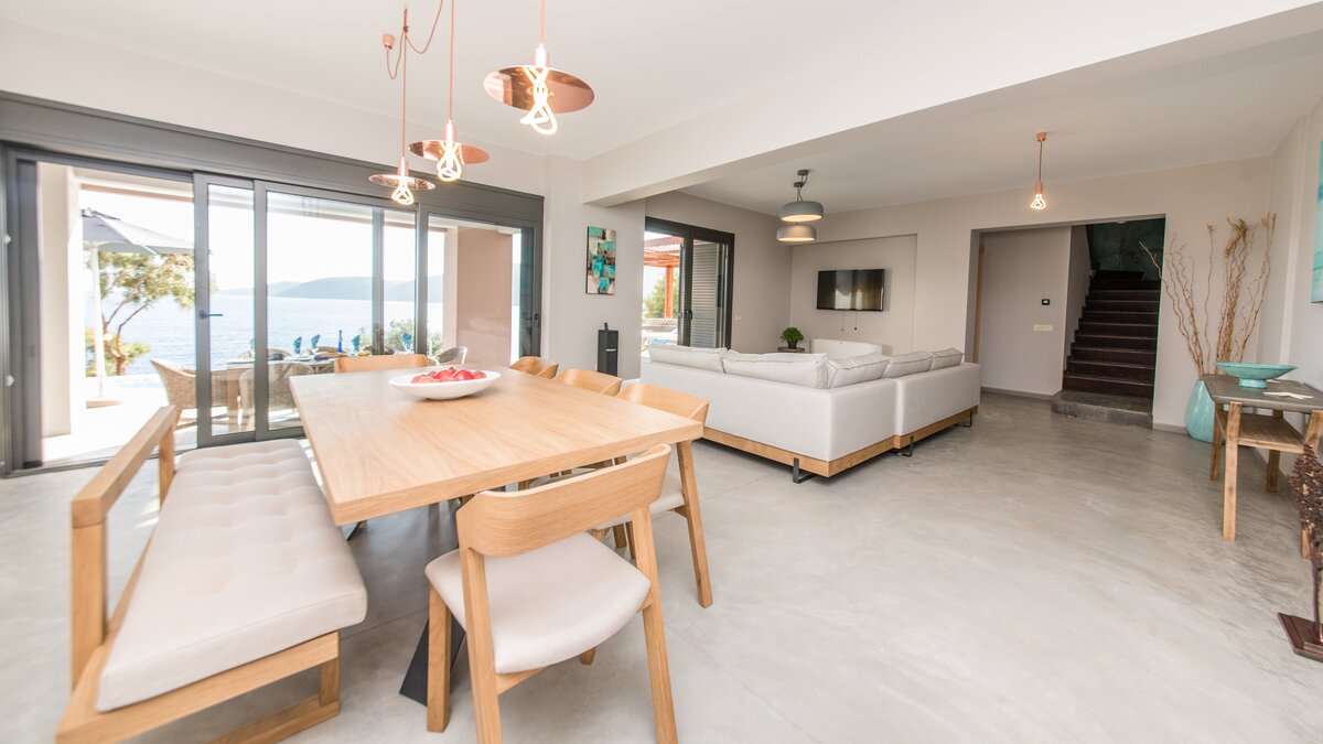 Der Azure Point befindet sich in einer wirklich atemberaubenden Lage direkt am Wasser und bietet einen ununterbrochenen Blick auf das Meer und einen Pfad, der zu einem Felsvorsprung führt, der in das glitzernde Ionische Meer ragt. Deren Außenbereich ist sorgfältig gestaltet, um das Beste aus der unglaublichen Aussicht zu machen, mit einem privaten Infinity-Pool, der in eine Terrasse versenkt ist, die mit großen Liegestühlen und weichen Sitzgelegenheiten ausgestattet ist. Deren Haus selbst ist so gestaltet, dass die Grenzen zwischen Innen- und Außenleben verwischt werden, mit Glasschiebetüren in der modernen, gut ausgestatteten Küche, die sich komplett zur Terrasse öffnet, um ein Gefühl im Freien zu schaffen. Von der Küche aus führen einige Stufen in das OFFENER GRUNDRISS Wohn- / Esszimmer, ebenfalls mit Schiebetüren, die zur Terrasse führen und den Raum mit Licht durchfluten.