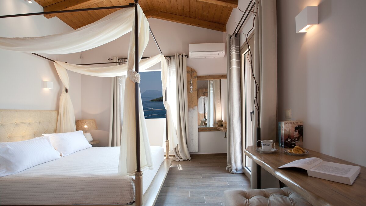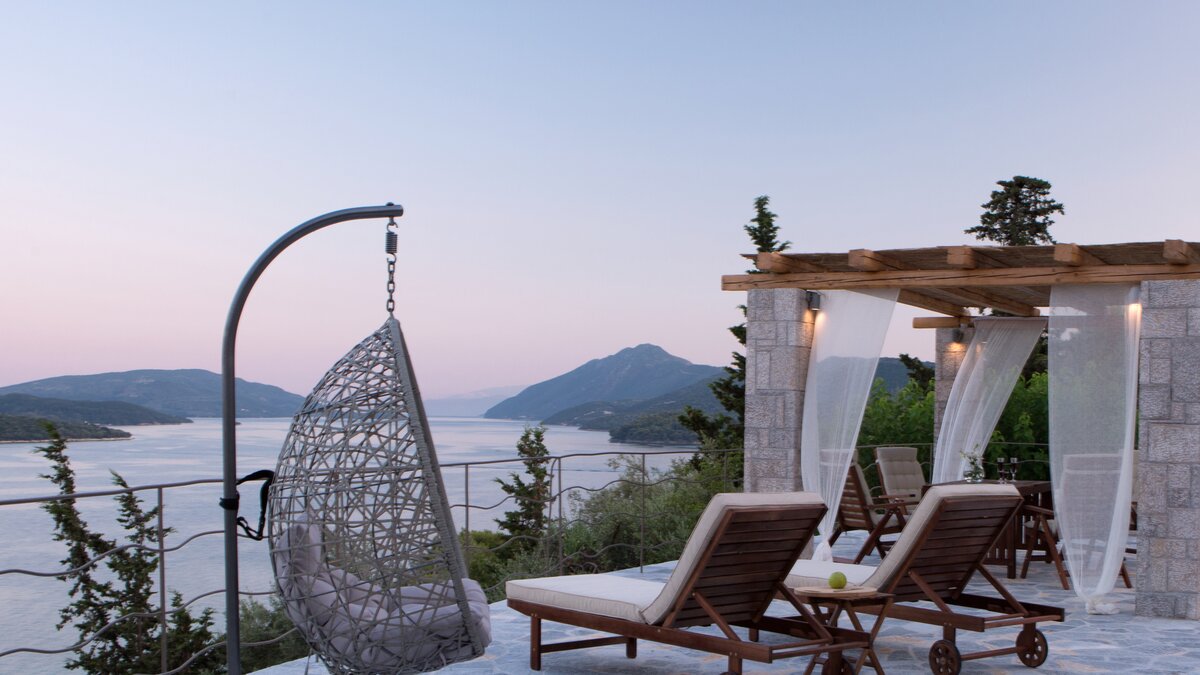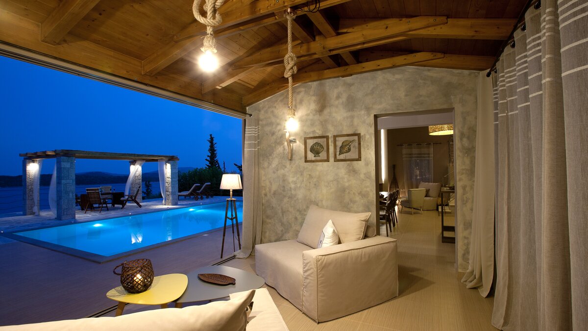 Eine kleine, aber fein geformte Villa in einer reizvollen Umgebung mit Blick auf die Inseln Skorpios und Sparti und in der Nähe eines bezaubernden Kieselstrandes.