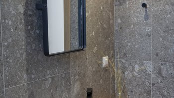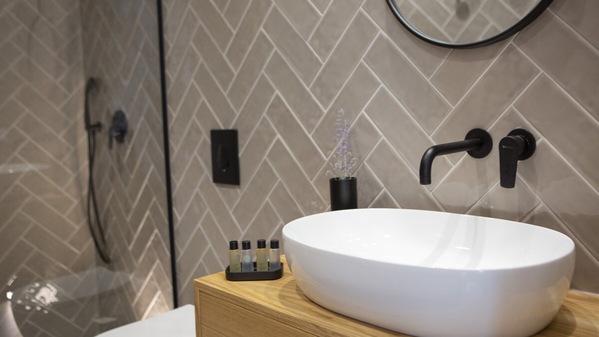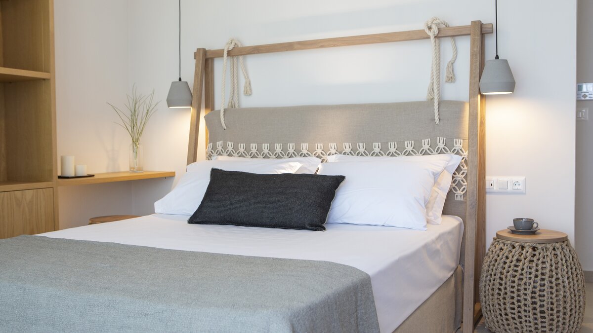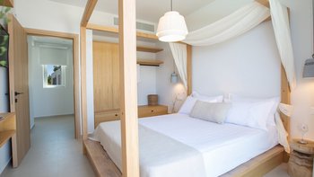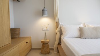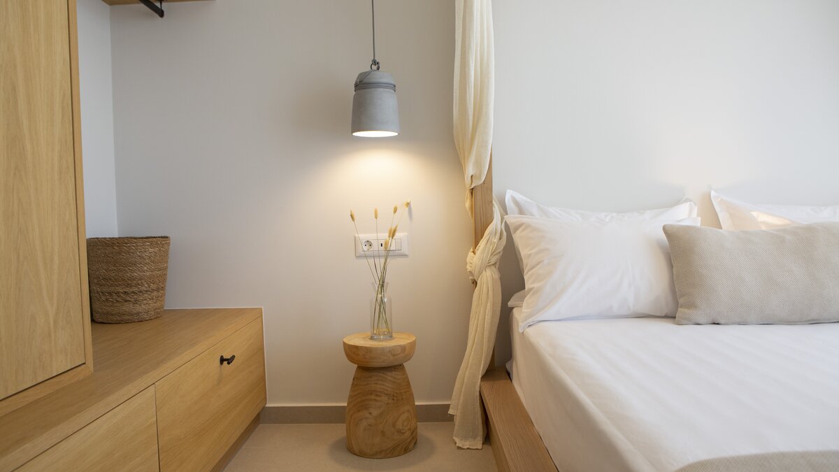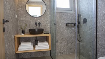 Im Obergeschoss befinden sich zwei elegante Schlafzimmer, jedes mit Doppelbett und eigenem Bad, das in sanften Naturtönen gestaltet ist. Denen großen Fenster bieten einen herrlichen Blick auf das Meer und die Landschaft. Denen modernen Bäder bieten eine elegante Ausstattung und viel Platz, sodass sich der Morgen mühelos und die Abende ruhig anfühlen.