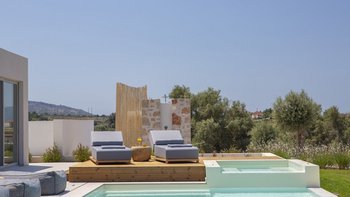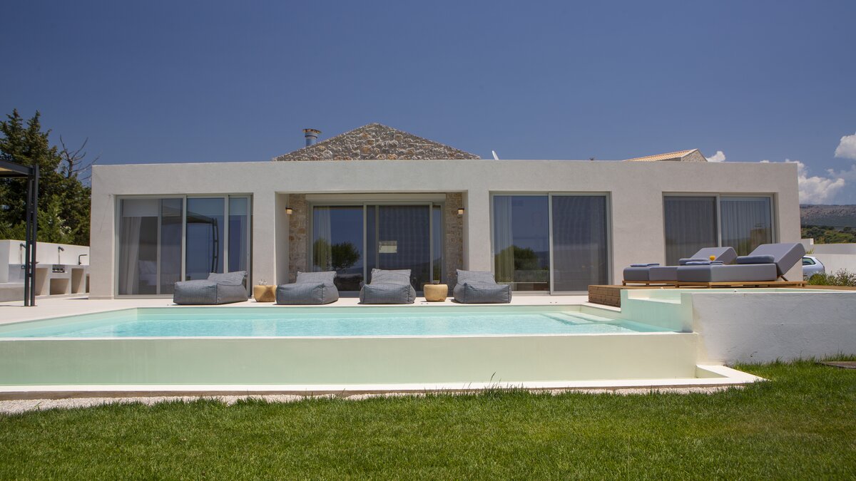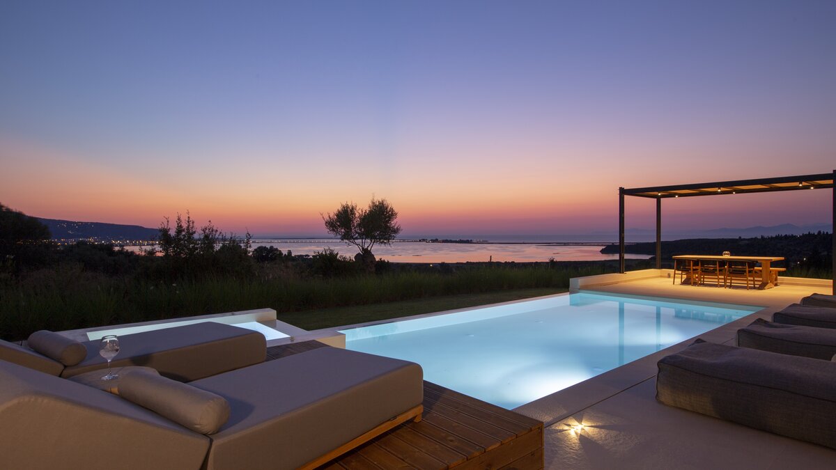 Vor der Tür steht der Privater Pool der Villa im Mittelpunkt; ein ruhiger Ort für ein morgendliches Bad oder lange Nachmittage unter der griechischen Sonne. Dessen großzügige Veranda und der umliegende Garten laden zum Essen im Freien oder einfach zum Entspannen in der sanften Meeresbrise ein. Wenn der Abend hereinbricht, färbt der ionische Sonnenuntergang den Horizont in goldenen und rosafarbenen Farbtönen; die perfekte Kulisse für ein unvergessliches Barbecue mit der Familie oder Freunden.