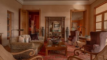 Die große, teilweise überdachte Terrasse, die die beiden Hälften des ersten Stocks verbindet, verfügt über einen Kamin und ist ideal für einen Sundowner mit Panoramablick auf den Sonnenuntergang über dem Atlasgebirge. Im Gästehaus gibt es ein weiteres Doppel- und Zweibettschlafzimmer, die etwas kleiner sind und zu einer Gemeinschaftsterrasse führen. Wenn man von der Terrasse in die weitläufigen Gärten spaziert, findet man den großen Privater Pool und die Terrasse mit bequemen Liegen und Sofas, das Poolhaus mit Küchenzeile, Hamam, Fitnessraum sowie einen Sandtennisplatz, Krocket- und Bouleplatz. Eine ultra-entspannende Atmosphäre wird durch Frühstück, Housekeeping-Service und Concierge-Service verstärkt, und die Köche bereiten das Mittag- und Abendessen zu. Mit einem sehr hohen Maß an Komfort und Service und einem guten Preis-Leistungs-Verhältnis ist dies eine sehr gute Option für Freunde oder Familien, die zusammen reisen.