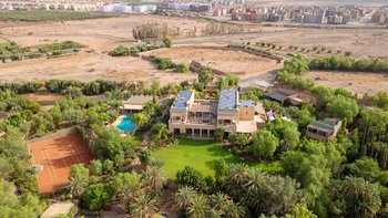 Wunderschöne, voll ausgestattete Villa mit großem Pool, Tennisplatz, Hamam und Yoga-Raum inmitten von Rasengärten. Angrenzend an den Golfplatz Assoufid und in der Nähe des lebhaften Marrakesch.