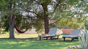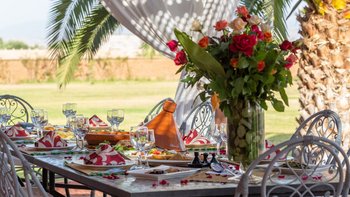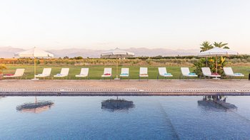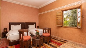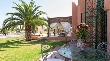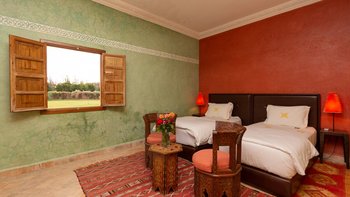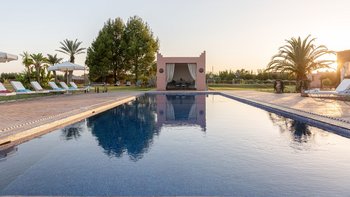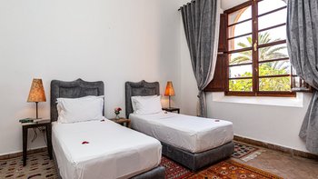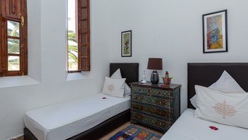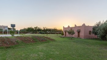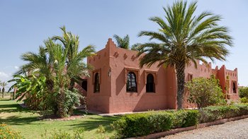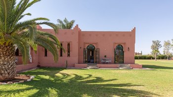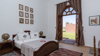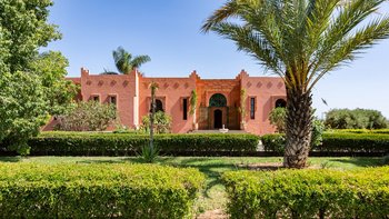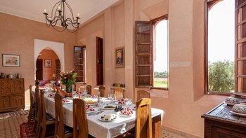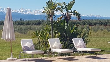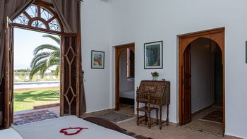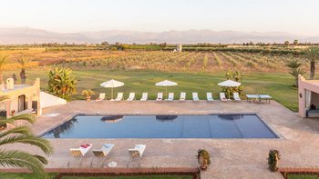 Die Aufteilung ist ideal für zwei Familien mit zwei Doppelzimmern und zwei Zweibettzimmern im Haupthaus sowie einem dritten Kinderzimmer und drei weiteren Garten-Suiten mit insgesamt 16 Schlafplätzen in drei Gebäuden. Auf der einen Seite befindet sich eine schattige Terrasse, auf der anderen Seite eine gemütliche Lounge im Freien und auf der anderen Seite ein Essbereich im Freien. Hier können die Gäste am Abend unvergessliche Sonnenuntergänge beobachten und nachts den Sternenhimmel bewundern. Inmitten der gepflegten Rasenflächen befindet sich ein beeindruckender 18 m langer Pool, von dem aus man den Blick über Hektar große Olivenhaine auf das Atlasgebirge genießen kann.
