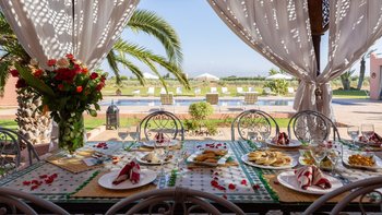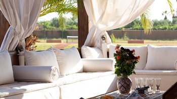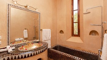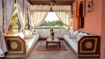 Terrakotta-Wände heben sich vor der Kulisse von üppigen grünen Gärten und dem atemberaubenden Atlasgebirge ab; Dar Jamil ist eine einladende Oase der Ruhe und bietet den Gästen den perfekten Rahmen, um sich vollkommen zu entspannen und zu entspannen. Dieser einladende Villa ist in warmen Erdtönen gehalten und mit üppigen Textilien, gemusterten Teppichen und Kissen, aufwendig handgefertigten Hängelampenschirmen und schönen LED-Badezimmern, die mit charakteristischen Zelige-Fliesen gefliest sind, dekoriert. Ein markanter zentraler Innenhof mit einem beruhigenden Wasserspiel ist ein idealer Ort für Yoga und führt zu verschiedenen Räumen. Die geräumigen Gemeinschaftsbereiche umfassen gemütliche Wohnzimmer und ein charmantes Esszimmer sowie eine voll ausgestattete Küche, in der ein hervorragender Koch alle Mahlzeiten zubereitet. Einem engagierten Hausmanager steht ebenfalls zur Verfügung, um sicherzustellen, dass die Gäste gut versorgt sind.