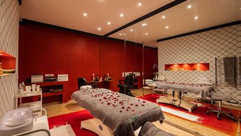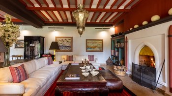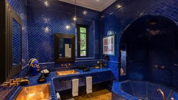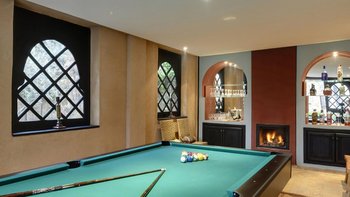 In einer begehrten Lage, nur 8 km von Marrakesch entfernt, befindet sich dieses exquisite Haus auf einem herrlichen Grundstück, wo Palmen und Pinien, Rasen und Rosengärten ein entspannendes Gegengewicht zu Badminton- und Paddle-Tennisplätzen, Tischtennis und Schach im Freien bilden. Der Juwel in der Krone der Gärten ist ein wunderschöner Swimmingpool, dessen Poolterrassen großzügig mit Liegen, Sofas und riesigen Sonnenschirmen bestreut sind, mit einem Hauch von traditionellem Komfort in Form eines großen Berberzelts. Ebenso gut in Form und Funktion durchdacht, verfügt das elegante Haus über einen eigenen Fitnessraum, ein Kino und einen Spiel- und Fitnessraum, ein Hammam- und Schönheits- und Massagezentrum.