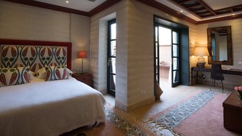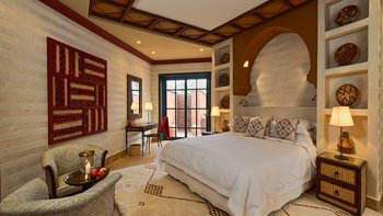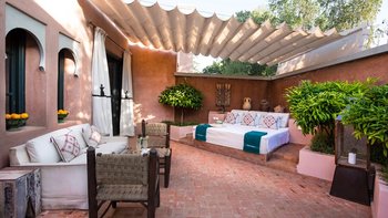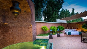 Jedes der drei Schlafzimmer mit eigenem Bad ist geräumig und wunderschön eingerichtet. Zwei der luxuriösen Schlafzimmer sind spiegelbildlich zueinander und verfügen über eine eigene Terrasse, große Tagesbetten und ein Tauchbecken mit Nachtbeleuchtung. Diesen beiden Schlafzimmer teilen sich einen internen intimen Sitzbereich mit Kamin und befinden sich in einem Gebäude neben der Hauptvilla. Alkhozama und/oder Ezzahra für größere Gruppen.