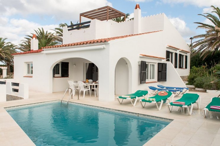 Kürzlich renoviert und ein perfekter Ort für einen Familienurlaub, diese wunderschöne Villa auf Menorca mit Panoramablick auf das Meer ist nur 1 km vom Sandstrand von Son Bou und diversen Annehmlichkeiten entfernt.