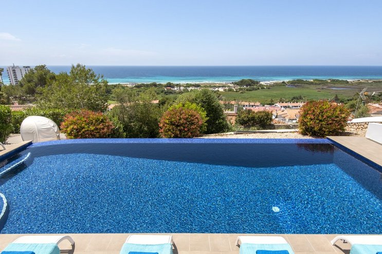 Die Villa Prestige ist eine helle und moderne Unterkunft für große Gruppen im sonnigen Menorca und bietet einen unglaublichen Weitblick über den Strand Son Bou.