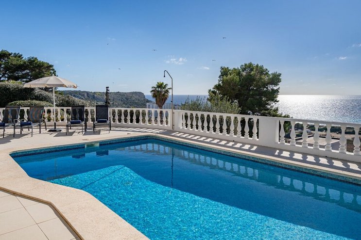 Mit einem atemberaubenden Blick auf die hübsche Bucht von Cala Moli, liegt diese Familienvilla auf Menorca direkt über dem Meer, mit Stufen hinunter zum eigenen Steg und Geschäfte und Restaurants sind nur eine kurze Autofahrt entfernt.