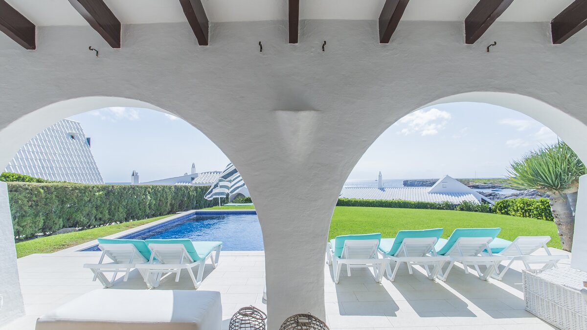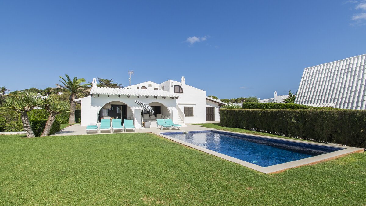 Die große, teilweise überdachte Terrasse ist mit großzügigen Sitzgelegenheiten, Sitzsäcken und einem Essbereich ausgestattet – der perfekte Rahmen für ein Abendessen im Freien vom Grill oder ein oder zwei Drinks, während die Sonne untergeht. Dessen Terrasse führt zum PRIVATER POOL, umgeben von Rasengärten. Ein Tor vom Grundstück öffnet sich zu einem Weg, der zu einem schmalen Zementpfad führt, der über die Felsen führt. Ein Leiter mit Stufen bietet Zugang zum Meer. Deren Anwesen ist nur 1,2 km von Binibeca mit seinen hübschen weiß getünchten Gebäuden und dem goldenen Halbmond Sandstrand mit Restaurant und anderen Einrichtungen entfernt. Deren Hauptstadt Mahón, nur 11 km entfernt, mit einer großen Auswahl an Geschäften und Restaurants, ist ebenfalls leicht zu erreichen.