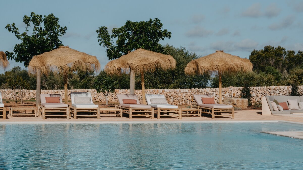 Draußen auf dem ländlichen Gelände befindet sich ein weitläufiger, ruhiger Pool mit schattigen Sitzgelegenheiten im Freien, der perfekte Ort, um die Sonne zu genießen und gleichzeitig den umliegenden Tieren zu lauschen.