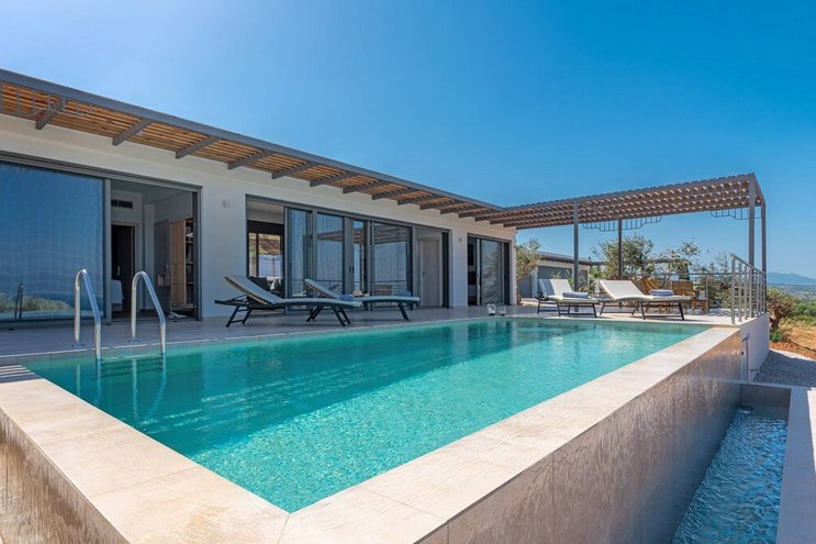 Die moderne und geräumige Unterkunft Villa Nupadi auf dem Peloponnes bietet einen unglaublichen Blick auf den Sonnenuntergang von ihrem eigenen Infinity-Pool.