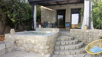 In den geräumigen Innenräumen dieser stilvollen Villa herrscht ein Gefühl der Gelassenheit. Vielleicht liegt es an dem Hintergrundrauschen des Meeres, das auf den Felsen unter Ihnen plätschert, oder an der attraktiven Verwendung natürlicher Materialien, die dem Haus einen Platz in renommierten Designmagazinen eingebracht haben, oder einfach daran, dass es nach den Grundsätzen des Feng Shui geplant und gestaltet wurde. Wahrscheinlich alle drei tragen ihren Teil dazu bei, ergänzt durch eine bequeme Einrichtung, ein aufgeräumtes Dekor in Erdtönen und eine herrliche Essterrasse, die sich direkt über einem von Felsen eingerahmten Sechs-Sitz-Whirl befindet und beide einen herrlichen Blick auf die Bucht bieten. Die drei klimatisierten Schlafzimmer der Villa sind eine ausgezeichnete Wahl für eine Familie oder eine Gruppe von Freunden und verfügen jeweils über ein eigenes Bad oder ein Duschbad. Deren Zimmer im Erdgeschoss bieten die Flexibilität von Doppel- oder Zweibettnutzung, während das Doppelzimmer im Obergeschoss sich auf einen schönen möblierten Balkon öffnet. Mit einem Felsenbad direkt darunter liegt die Villa nur wenige Schritte von den Geschäften, Bars und Tavernen von Stoupa und dem Sandstrand von Stoupa entfernt.