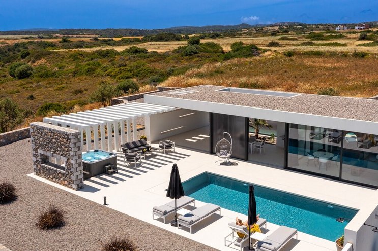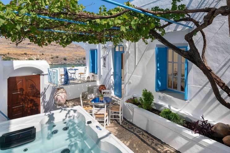 Perfekt als romantischer Rückzugsort für zwei Personen, Rodos Blu ist eine moderne Villa mit stilvollem Interieur, herrlicher Aussicht und einem eigenen beheizten Jacuzzi.