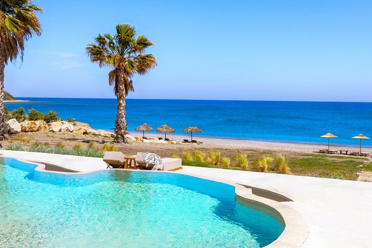 Diese Boho-Chic-Villa ist ideal für Gruppen von Familien oder Freunden, mit viel Platz, privatem Pool, direktem Strandzugang und herrlichem Meerblick.