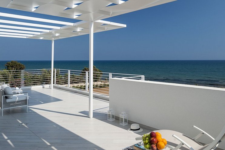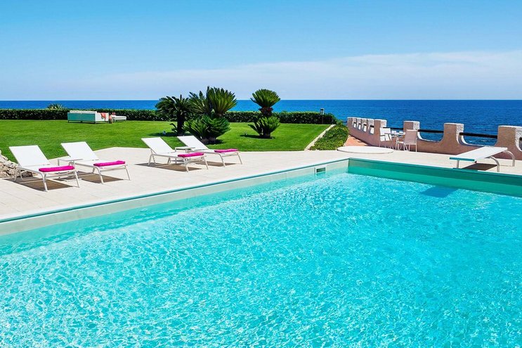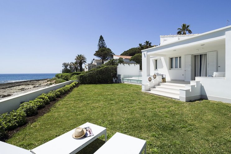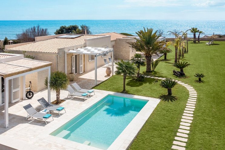 Luna Mare ist eine atemberaubende sizilianische Villa mit privatem Pool und direktem Strandzugang in herrlicher Lage direkt am Meer in der Nähe des Badeortes Fontane Bianche.