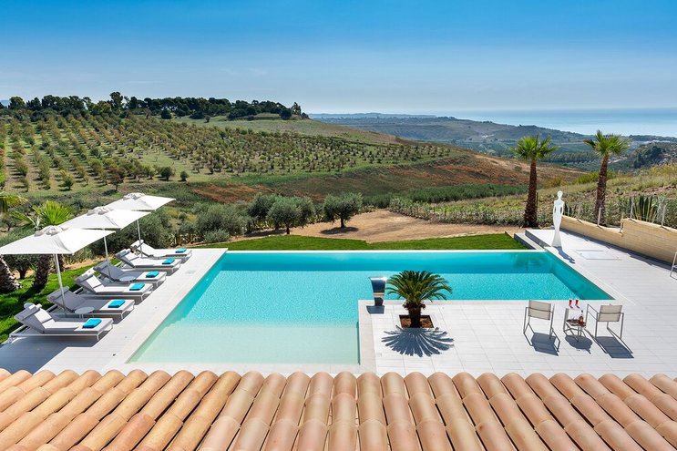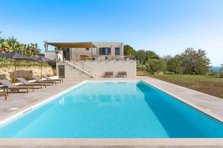 Eine gut ausgestattete moderne Villa mit einem atemberaubenden Poolbereich mit Blick auf das Meer. Dieser nach Süden ausgerichtete Villa ist sehr großzügig für eine kleinere Gruppe und liegt in der Nähe des Strandes und der historischen Stadt Sciacca.