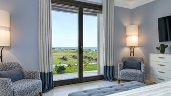 Im ersten Stock befinden sich drei Schlafzimmer. Des Hauptschlafzimmer mit Bad en suite und zwei Doppelschlafzimmer mit Dusche en suite. Aller diese Zimmer haben direkten Zugang zum Balkonbereich, wo weiche Sitzgelegenheiten zur Verfügung stehen, um den Panoramablick auf das Meer zu genießen.