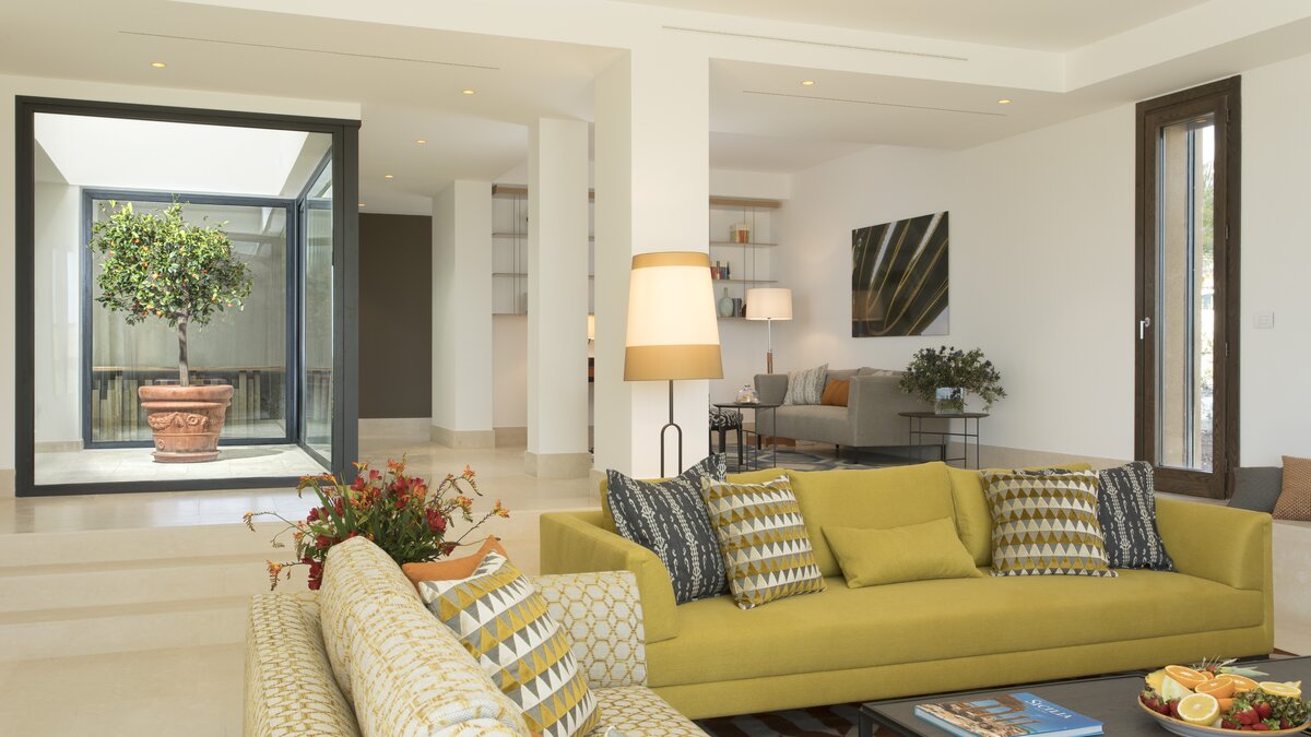 Im Erdgeschoss, durch die Eingangshalle, werden die Gäste vom OFFENER GRUNDRISS Wohnzimmer mit Ess- und Küchenbereich begrüßt. Moderne Innenräume und Dekorationen wurden sorgfältig ausgewählt und platziert, um eine ruhige Atmosphäre zu schaffen. Dank der großen Fenstertüren, die um den Raum herum angeordnet sind, halten alle Bereiche Licht und bieten Zugang zur Außenterrasse, wodurch ein nahtloser Lebensstil im Innen- und Außenbereich entsteht.
