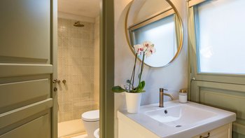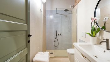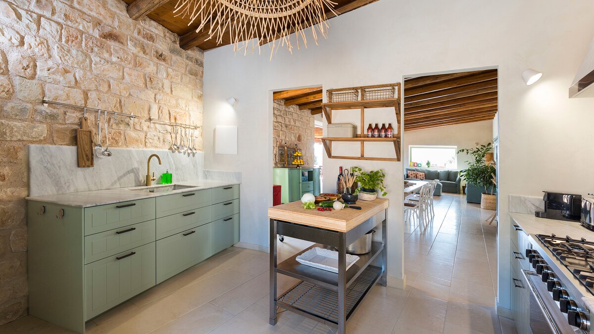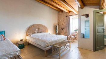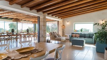 Im Inneren ist die Villa ruhig, luftig und lichtdurchflutet. Der Hauptwohnbereich ist offen und einladend, wo hohe Fenster die Aussicht rahmen und das Äußere hereinbringen. Natürliche Materialien und gedeckte Töne sind durchzogen und schaffen ein Gefühl von ruhiger Eleganz, das sowohl stilvoll und auch beruhigend ist. Des Hauses verfügt über sechs Schlafzimmer, jedes mit eigenem Bad, das Komfort und Privatsphäre für die gesamte Gruppe bietet. Zwei der Zimmer befinden sich in der Hauptvilla, drei sind von außen zugänglich, um zusätzliche Abgeschiedenheit zu gewährleisten, und ein letztes Schlafzimmer befindet sich im Obergeschoss mit herrlicher Aussicht. Eine gemütliche Lounge und eine schön eingerichtete Küche vervollständigen den Innenraum, ideal für ein einfaches Frühstück oder entspannte Abende.