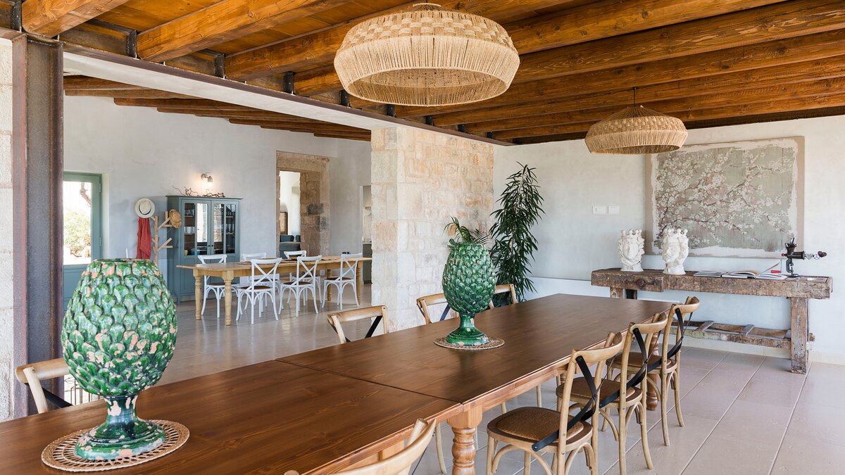 Draußen ist die Umgebung genauso besonders. Schattige Terrassen erstrecken sich entlang des Hauses und eignen sich perfekt für ein langsames, sonnenverwöhntes Mittag- oder Abendessen unter dem Sternenhimmel. Der Salzwasser-Pool glitzert in der Sonne, Liegestühle warten in der Nähe und ein Whirlpool befindet sich direkt daneben, um sich verwöhnen zu lassen. Dessen Landschaft erstreckt sich über sanfte Falten von Olivenbäumen und weite Ausblicke auf das Meer und schafft eine Kulisse natürlicher Schönheit und Ruhe.