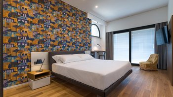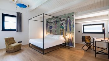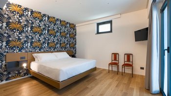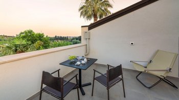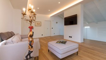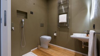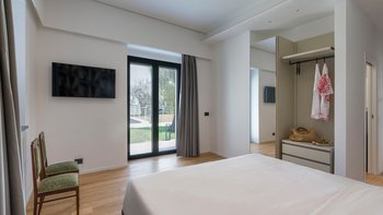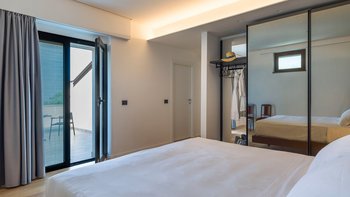 Wenn Sie die Holztreppe hinaufgehen, gelangen Sie zu einem wunderschön gestalteten Zwischengeschoss, wo Sie den Komfort eines Wohnbereichs mit Smart-TV genießen können. Auf dieser Etage befinden sich auch zwei Doppelschlafzimmer mit jeweils eigenem Duschbad und Terrasse. Zwei weitere Doppelschlafzimmer befinden sich auf dieser Etage mit einer Gemeinschaftsdusche.