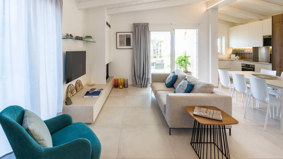 Im Inneren werden die Gäste von einem offenen Grundriss Wohn-, Ess- und Küchenbereich begrüßt. Dieser Raum ist mit hochwertigen Innenräumen ausgestattet, mit modernen Geräten ausgestattet und ist ein ruhiger Bereich, in dem sich die Gäste entspannen können, während sie hochwertige Zeit miteinander verbringen. Weiters in der Villa gibt es drei Doppelschlafzimmer; alle mit Dusche en suite und ein zusätzliches Schlafzimmer im Gartenanbau, mit eigenem Zugang zum Außenbereich. Aller dieser Zimmer sind sauber und frisch und auf höchstem Niveau eingerichtet.
