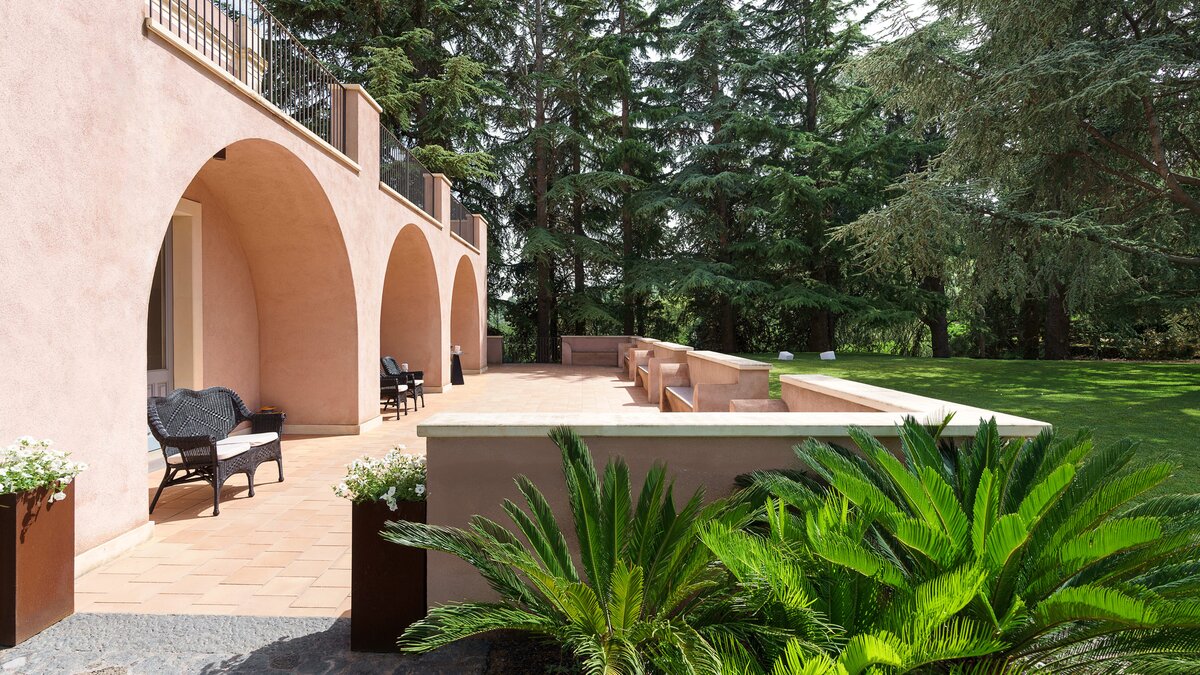 Zwischen dem Mittelmeer, dem Ätna und einem Wandteppich von Zitrusplantagen liegt die charmante, rosafarbene Steinvilla Tenuta Carricante mit atemberaubendem Meerblick.