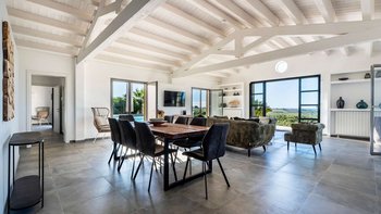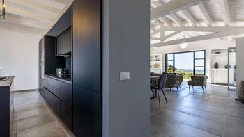 Im Inneren werden die Gäste von einem offenen Grundriss Wohn- und Essbereich begrüßt. Dieser Zimmer ist hochwertig eingerichtet, bietet viel natürliches Licht und verfügt über eine Handvoll Fenstertüren, die für einen nahtlosen Innen- und Außenlebensstil mit Panoramablick auf das Meer und das Tal sorgen. Weiters gibt es eine elegante und geschmackvoll gestaltete Küche mit Frühstückstheke und drei modernen Schlafzimmern; ein Hauptschlafzimmer mit Dusche en suite, ein Doppel- und Zweibettschlafzimmer, die sich ein Duschbad teilen.