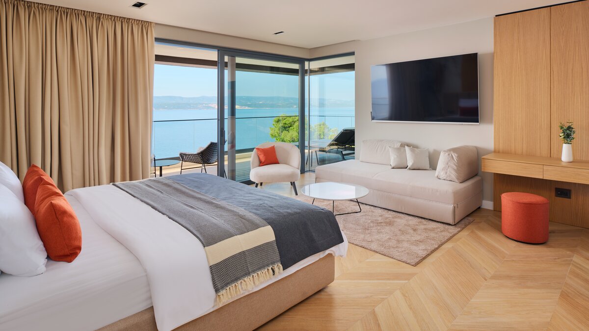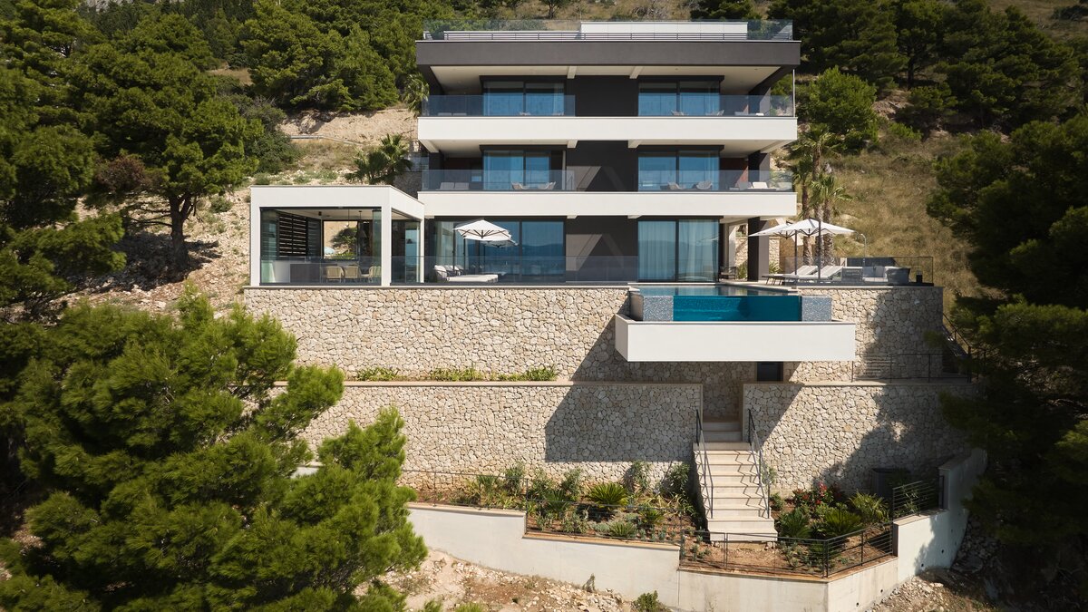 Die Villa Venus ist eine Meisterklasse in modernem Design und ist ein großzügiger Rückzugsort mit acht Schlafzimmern am Wasser in der Nähe von Split, Kroatien, mit zwei verschiedenen Poolbereichen, einem Home-Fitnessstudio und einer privaten Sauna.