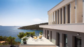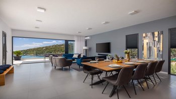 Draußen können die Gäste ihr eigenes kleines Stück Paradies über der Adria genießen, in das der private Infinity-Poolrand scheinbar mündet. Bequeme Holzliegen säumen den gegenüberliegenden Rand des Pools, während eine überdachte Terrasse willkommenen Schatten als Alternative zur Sonnenterrasse bietet. Eine Terrasse im Freien ist über den Wohnbereich zugänglich und ist bei Sonnenuntergang kaum zu überbieten. Eine private Treppe führt den ganzen Weg hinunter zum Meer zum Schwimmen und zum Anlegen eines eigenen Bootes.