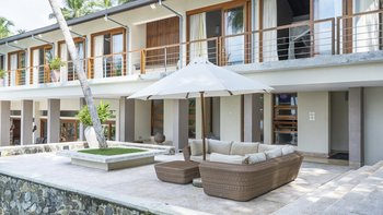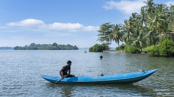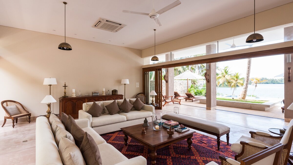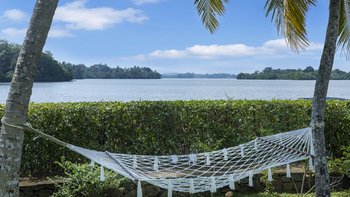 Die Villa Frangipani liegt perfekt am Wasser und bietet einen atemberaubenden Blick über den Koggala-See. Sie befindet sich in einer magischen und ruhigen Umgebung, ideal für einen erholsamen Kurzurlaub an der Südküste Sri Lankas. Dieser moderne, mit Teakholz verkleidete Haus verfügt über ein elegantes Interieur mit einer gleichbleibenden neutralen Farbpalette. Ein offenes Grundriss Zimmer im Erdgeschoss beherbergt ein helles und luftiges Wohnzimmer und einen Essbereich mit herrlichem Seeblick, der sich auf die Terrasse öffnet, die für Mahlzeiten im Freien eingerichtet ist. Dessen Küche vervollständigt das Erdgeschoss, wo der ausgezeichnete Küchenchef der Villa eine Mischung aus traditionellen sri-lankischen und internationalen Gerichten zubereitet. Im Außenbereich befindet sich der einladende Infinity-Pool auf drei Ebenen, wo Sie nach Belieben sitzen, schwimmen oder paddeln können. Liegen und Sonnenschirme laden zum Entspannen am Pool ein. Der weitläufige tropische Garten bietet üppige Rasenflächen, wiegende Palmen, rosafarbene Bougainvillea- und Frangipani-Bäume. Deren Hängematte am See ist der perfekte Ort, um zu lesen oder einfach nur zu entspannen und die Welt vorbeiziehen zu sehen. In den frühen Morgenstunden sehen Sie die Fischer, die mit ihrem neuesten Fang zum nahe gelegenen Steg zurückkehren.