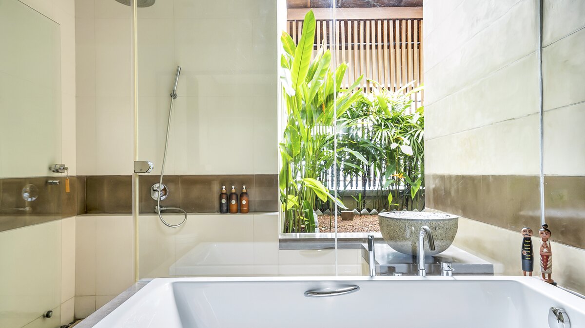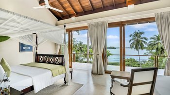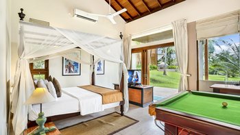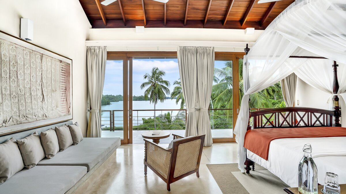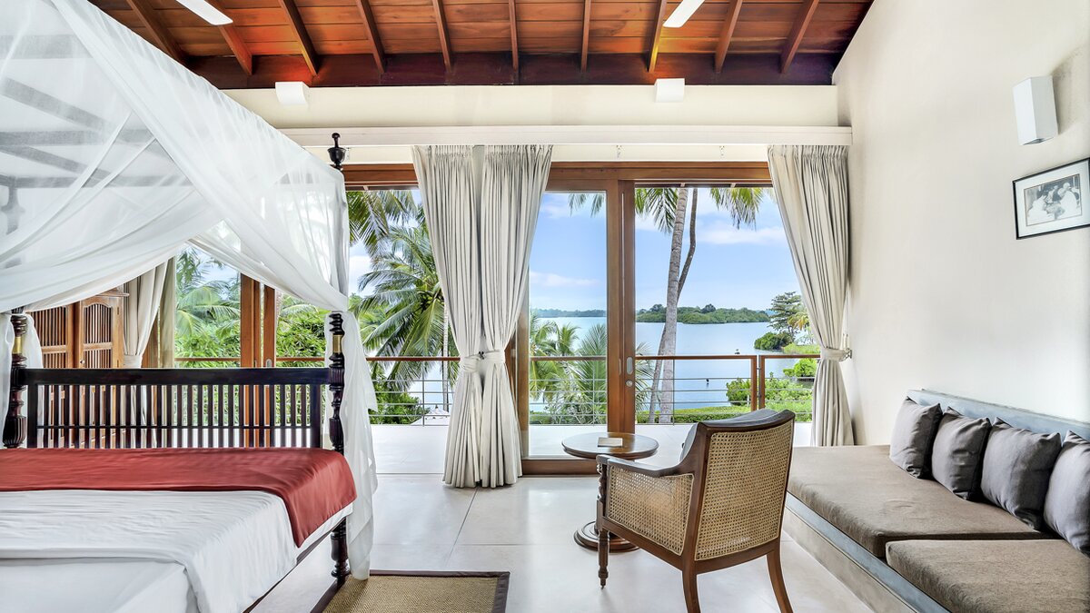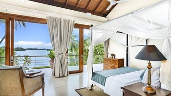 Im Obergeschoss des Haupthauses befinden sich vier schöne, geräumige und fast identische Schlafzimmer mit eigenem Bad, die alle klimatisiert sind und über ein Himmelbett verfügen und auf den See blicken. Denen beiden zentralen Zimmer sind miteinander verbunden und daher ideal für Familien mit Kindern. Jedes Zimmer verfügt über eine überdachte Außendusche, eine Innenbadewanne, zwei Waschbecken und einen kleinen privaten Garten, während sich eine gemeinsame, offene Aussichtsterrasse entlang der Schlafzimmer erstreckt, die mit Sitzgelegenheiten aus Korbgeflecht geschmückt ist. Eine separate, klimatisierte Gard Suite bietet viel Platz und Privatsphäre und beherbergt ein Himmelbett, ein eigenes Bad, einen begehbaren Kleiderschrank, ein Wohnzimmer mit Satellitenfernsehen und einen Billardtisch. Es gibt auch eine überdachte Sitzgarnitur im Freien, die einen beeindruckenden, unberührten Blick auf den Pool und den See ermöglicht.