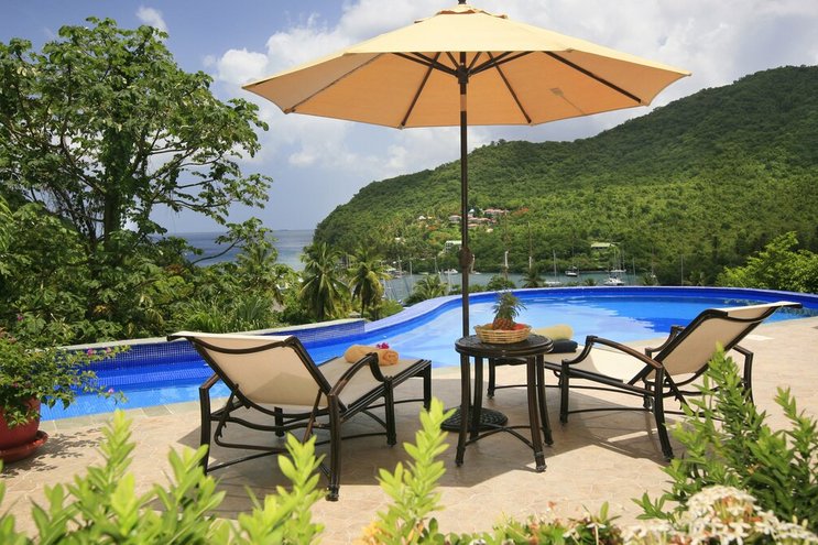 Die Krönung einer bewaldeten Landzunge an der Spitze der Marigot Bay ist eine atemberaubend gelegene Luxusvilla in St. Lucia mit einem großen Garten, einem 20 Meter langen Pool und einem Uferweg.