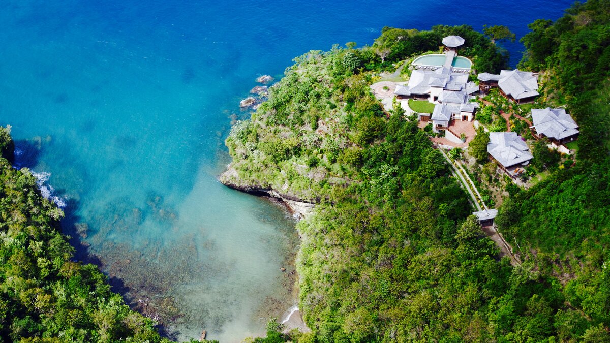 Die Krönung einer bewaldeten Landzunge an der Spitze der Marigot Bay ist eine atemberaubend gelegene Luxusvilla in St. Lucia mit einem großen Garten, einem 20 Meter langen Pool und einem Uferweg.