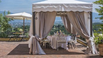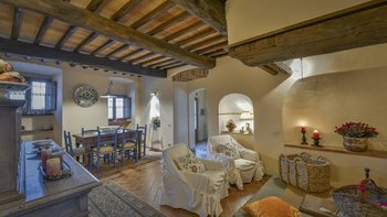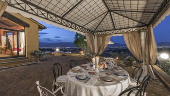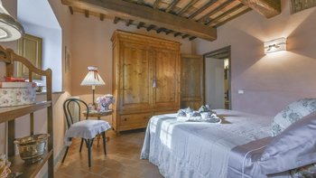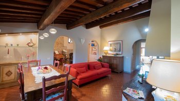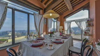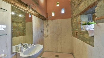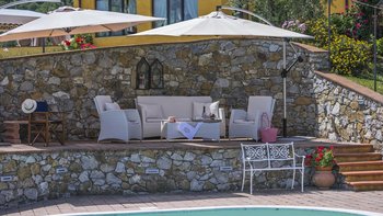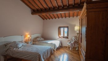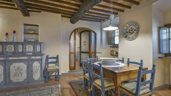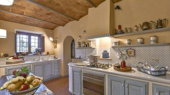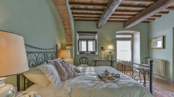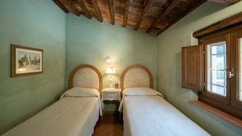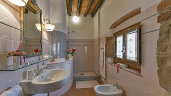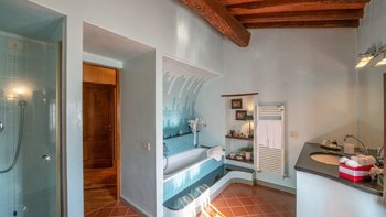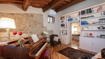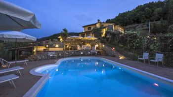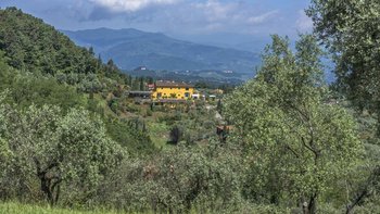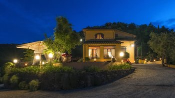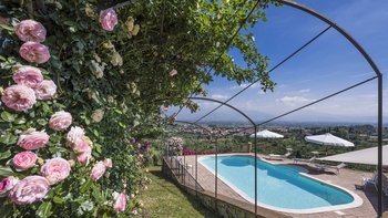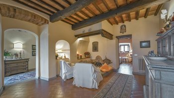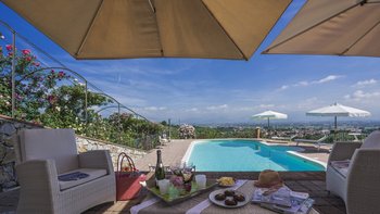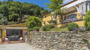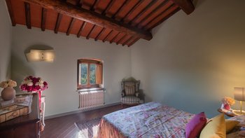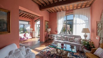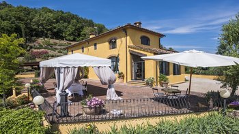 Abgeschieden auf dem Land, nur 1,5 km von den Geschäften und Restaurants in Casalguidi und 11 km von allen Annehmlichkeiten des historischen Pistoia entfernt, ist dieses hübsche gelbe Haus mit atemberaubendem Panoramablick von Anfang an beeindruckend. Umgeben von Olivenhainen, Obstbäumen und zarten Rosengärten ist dies ein Rückzugsort, der für absolute Privatsphäre geschaffen wurde. Der große Swimmingpool im Freien lädt mit Liegestühlen, möblierten Terrassen und übergroßen Sonnenschirmen zu entspannten Tagen ein, während die Villa im klassischen Country-Chic-Chic verwöhnt wird. Durch die geräumige Haupteingangshalle ist die große offene Lounge eine Oase der Entspannung, die mit Sofas für Waschbecken und aufwendig gemusterten Teppichen ausgestattet ist. Sowohl einfach als auch raffiniert, einige der auffälligen Möbel des Raumes umfassen ein altes Holzpiano und den auffälligen Eckkamin. Durch das Wohnzimmer hat ein angrenzender Essbereich Glasschiebetüren, die auf eine charmante Terrasse mit herrlichem Blick auf die Landschaft führen. Weiters geht es in die geräumige High-Spec-Küche – ausgestattet mit allen notwendigen Annehmlichkeiten – und es gibt eine zweite gemütliche Sitzecke mit Sesseln und einem kleineren Kamin. Nach dem gleichen rustikal-chic Stil hat jedes der Schlafzimmer ein einfaches Design mit subtilen pastellfarbenen Wänden und Holzbalkendecken. Den Schlafzimmern und Sitzzimmern im Erdgeschoss und im ersten und ersten Stock ist das Layout ideal für zwei Familien.